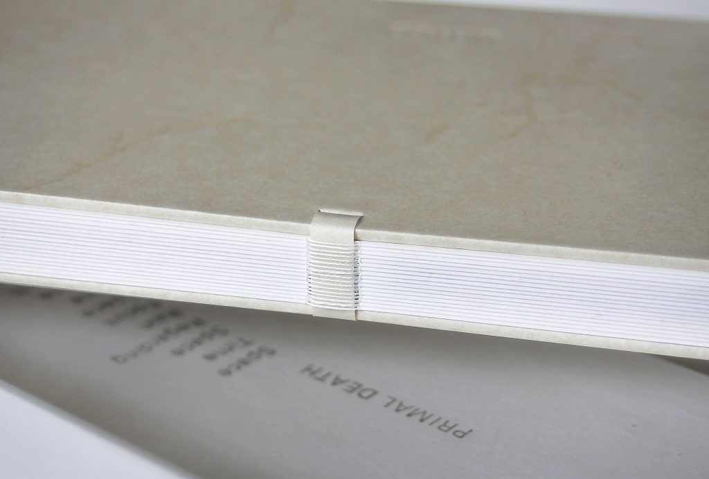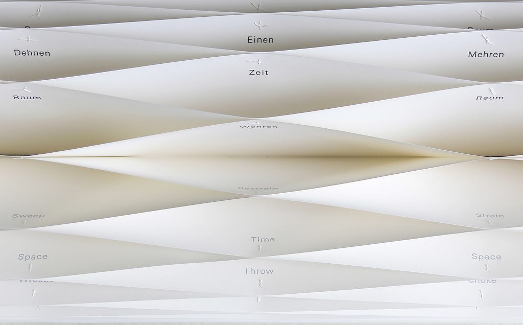 Urtod is housed in a clamshell box. The Poem in original German and in English translation is Intaglio printed inside the clamshell box. Each of the 47 words are embossed using hot metal typesetting in both German (in dark gray) and English translation (in light gray) in the book. Edition size of 18