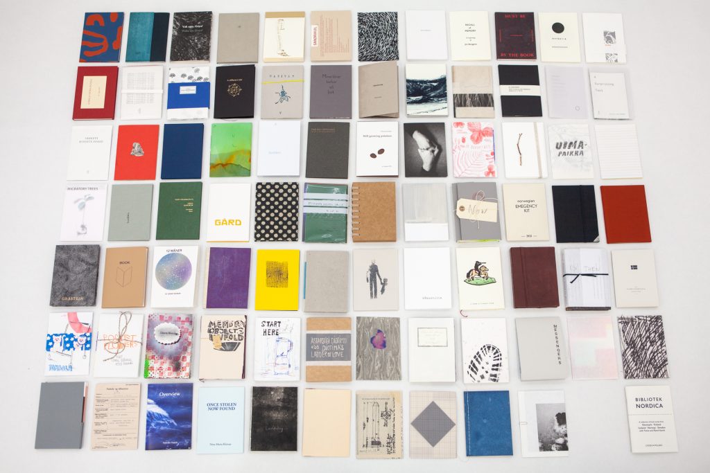 A library collection of 82 artists’ books by invited artists from Denmark, Finland, Iceland, Norway and Sweden gives a unique insight into the practice of making books in this part of the world at this moment (2019). The books, housed in a hand built box, are all A6 size (14,8 x 10,5cm) with a maximum width of 2cm. Each of the invited artists contributed with an edition of 11 books, produced specially for this project. The library has been made in an edition of 10, with the 11th book being exchanged between all the artists. The project is both a collection and a book work in its own right, existing as set of explorations in a box, instead of a codex form.