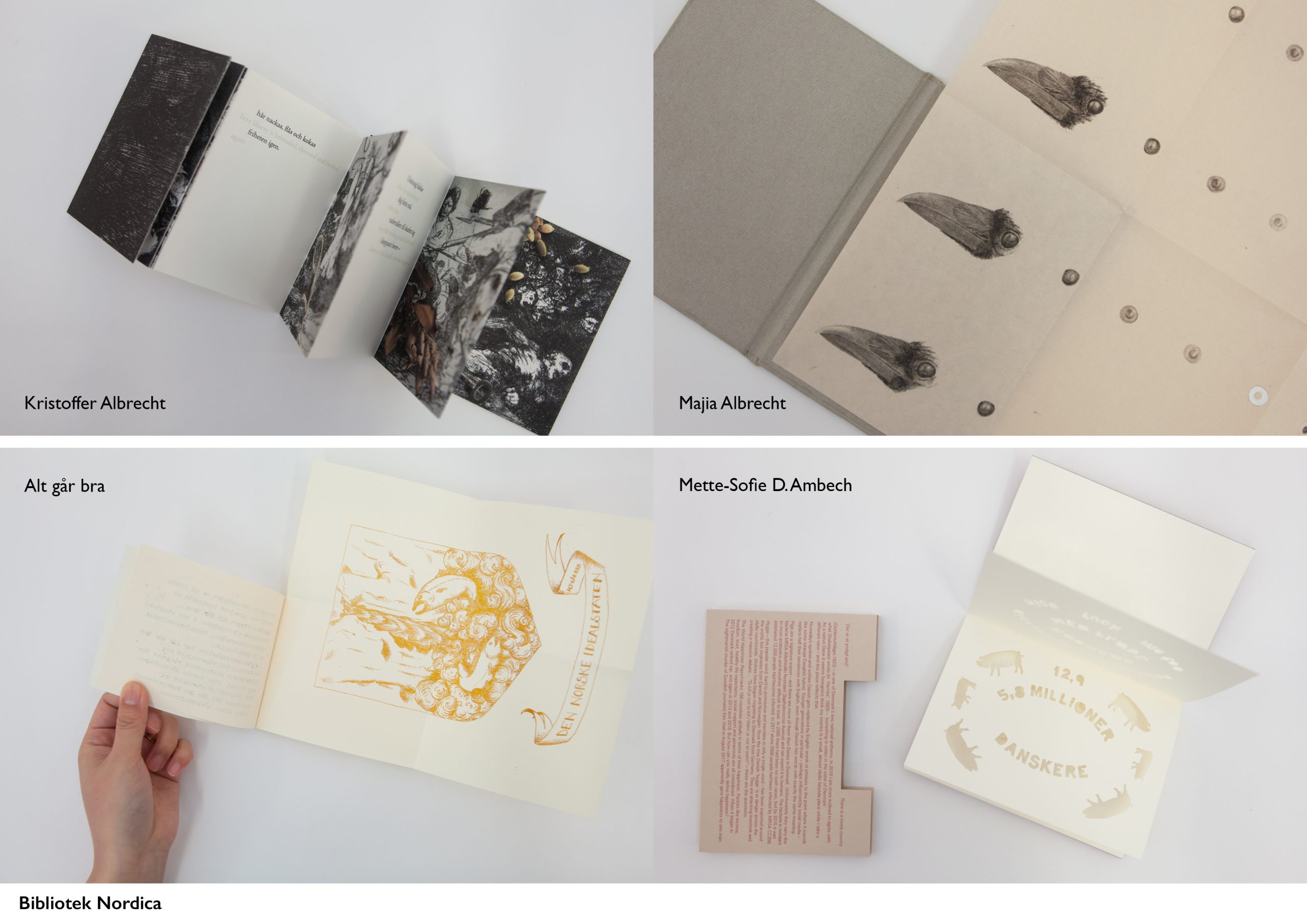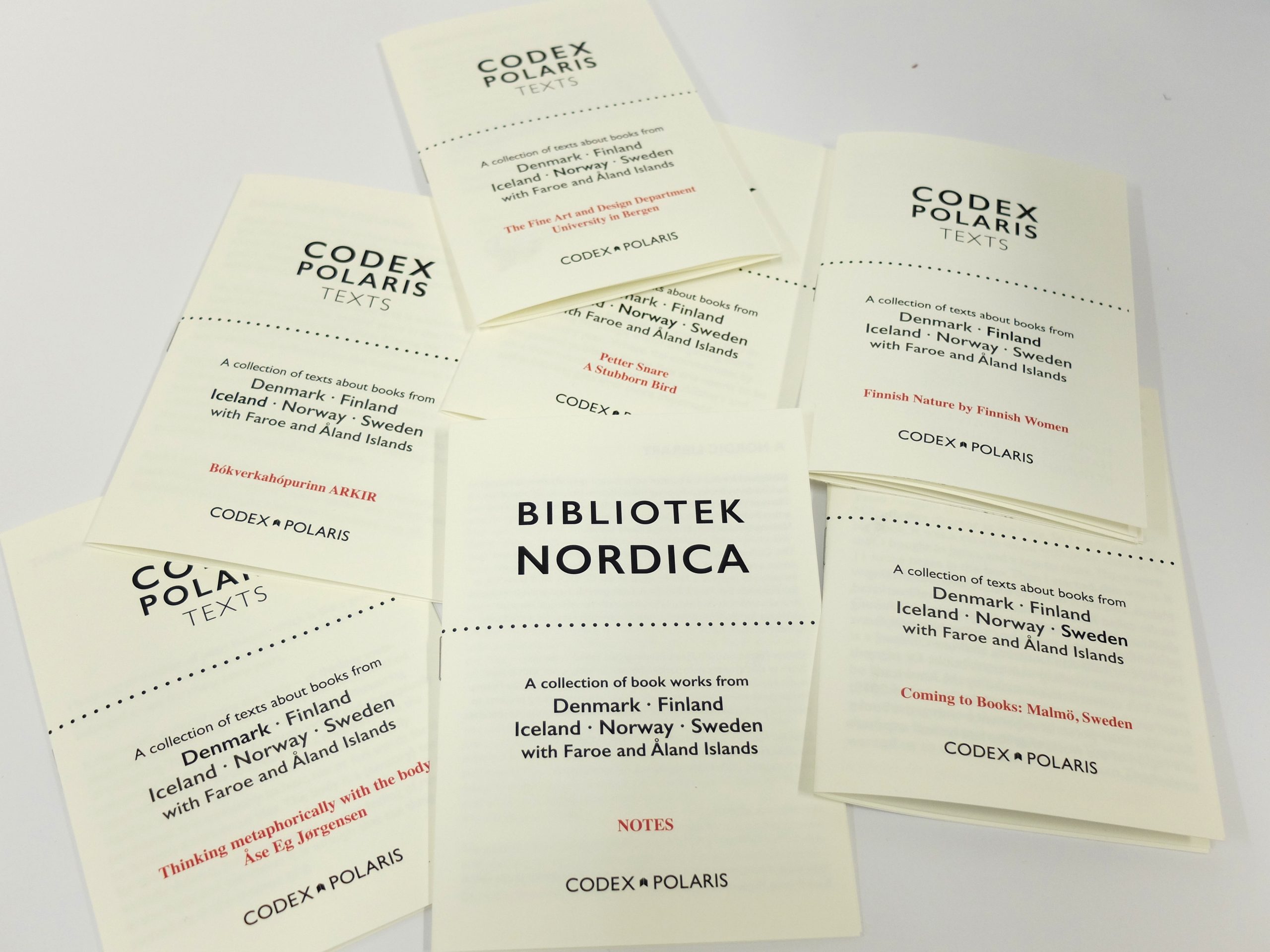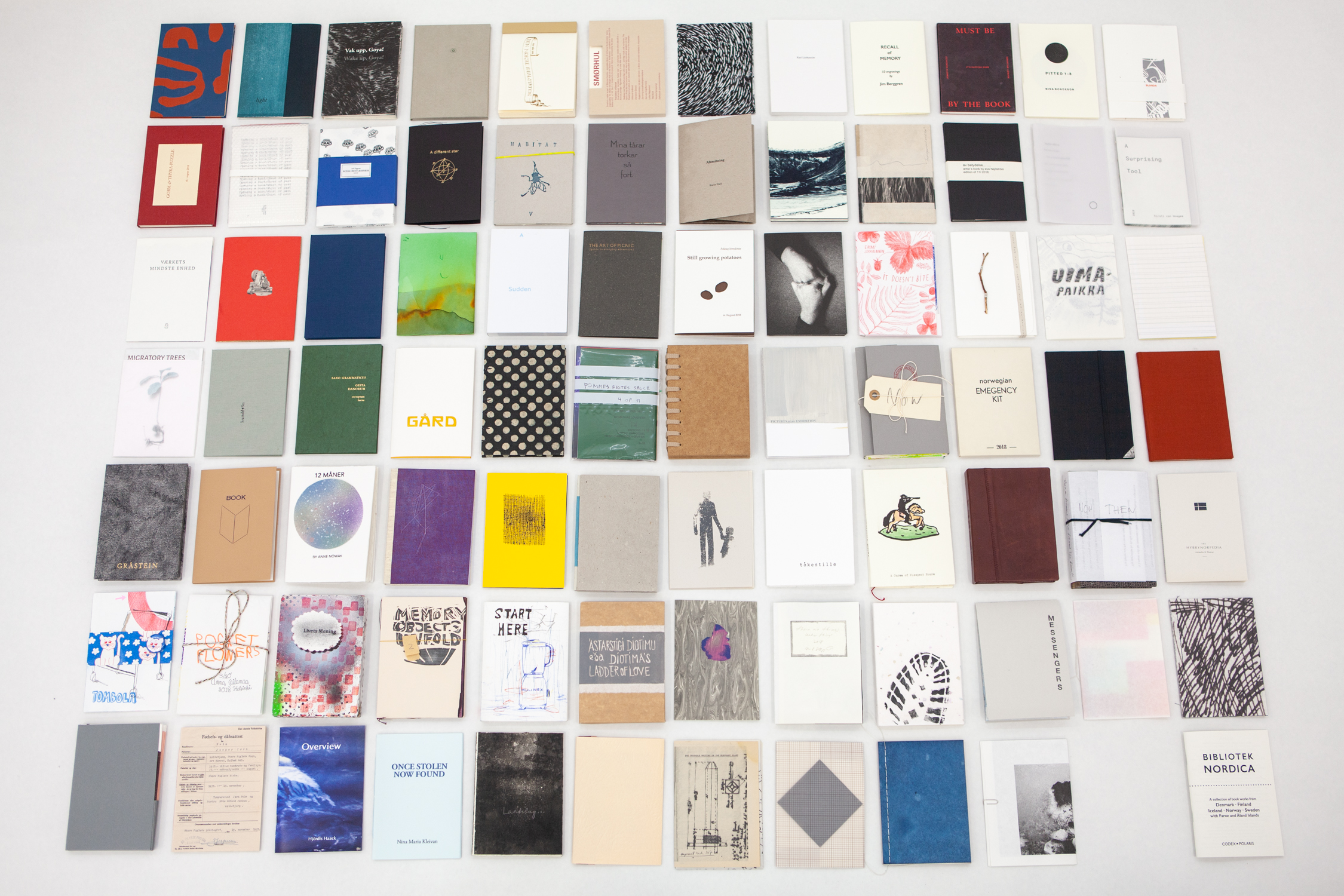 Bibliotek Nordica is a Codex Polaris production coordinated by Imi Maufe in collaboration with Megan Adie and Bent Kvisgaard. It was created for the international Nordic focus at the Codex Book Fair and Seminar in the San Francisco Bay Area, USA in February 2019 and was also launched at the Codex Fair, since then it has been shown at Malmö Kunsthall and Göteberg Biennale, Sweden; Frankfurt Book Fair, Germany, and Bristol Artists Book Event, UK, and with future exhibitions at Kristiansand Kunsthall, Norway; Iceland’s National Bibliotek, Reykjavik; Risk(U), Stockholm; and Small Publisher’s Fair, London (all 2021).