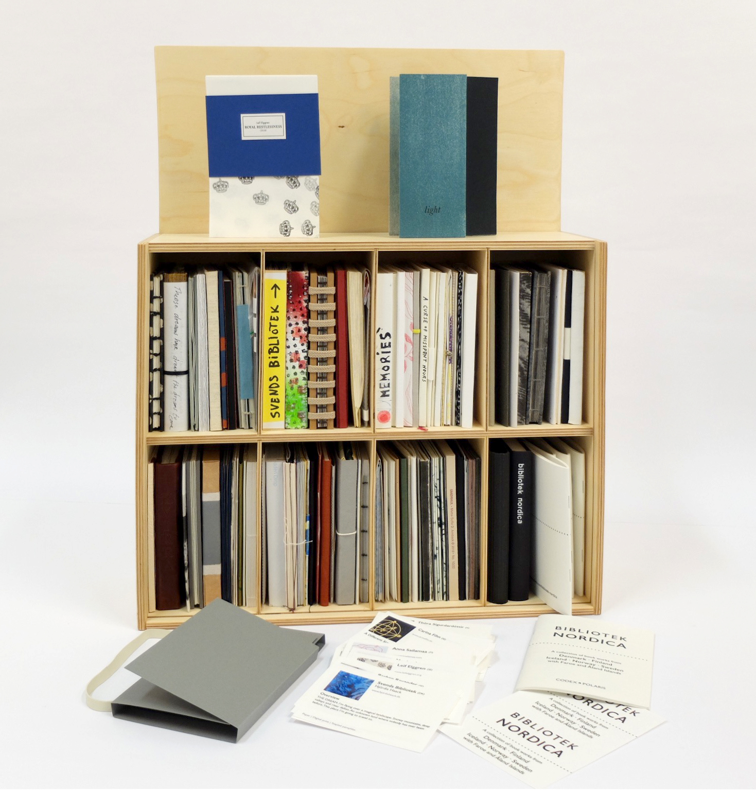 Bibliotek Nordica was assembled at Vingaards Officin Book Printing Museum, with the help of VO members, CC Tryk (printers), Morten Jørgensen (carpenter), and Bruunshaab Cardboard and Box Museum, all in Viborg, Denmark.Thanks to Katarzyna Roman for graphic design input.