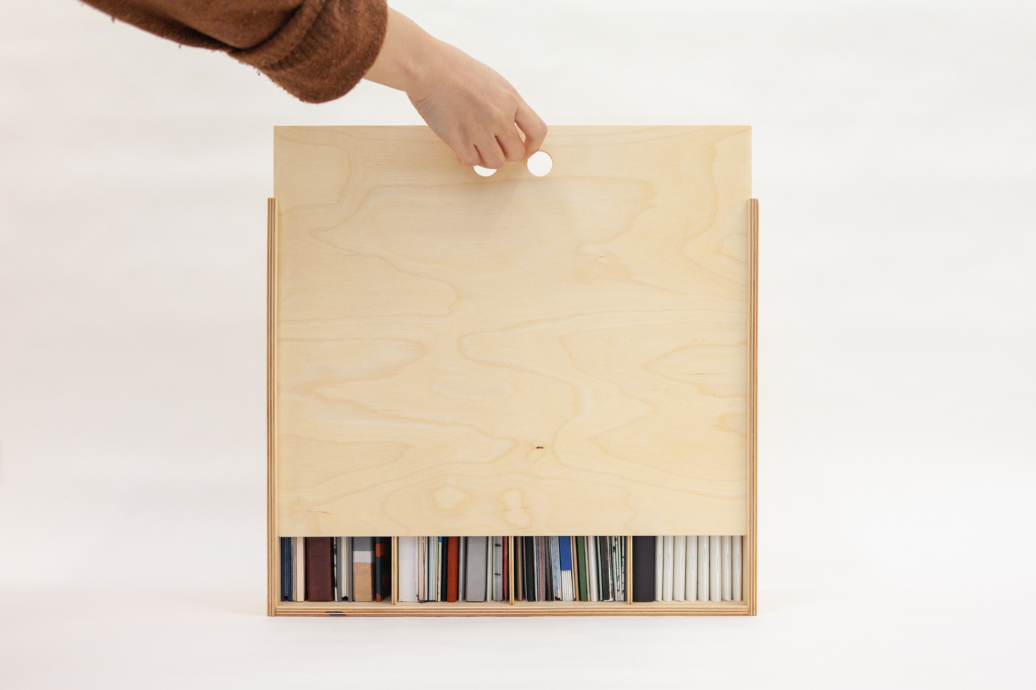 A birch ply wooden box, containing books made in paper, wood, leather, plastic, cloth, using a wide variety of techniques from concertina and loose leaf booklets, to intricate bindings.
