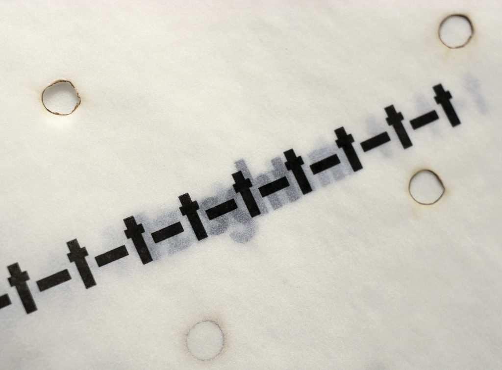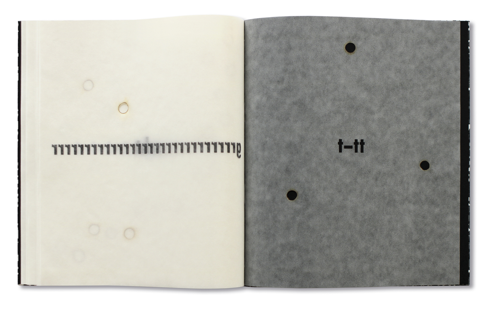 The 35 lines of the poem are distributed across the pages of the book. Each page has only one line. Because of the transparency of the glassine paper, the previous and subsequent lines show through. The text is reversed on each left-hand page, and legible on each right-hand page. By choosing a sans serif font (Futura Bold Condensed) the lower case letters “t” are reminiscent of the crosses of fallen soldiers. The printed pages of the book have been “injured,” with 72 holes burned into them that evoke bullet holes.