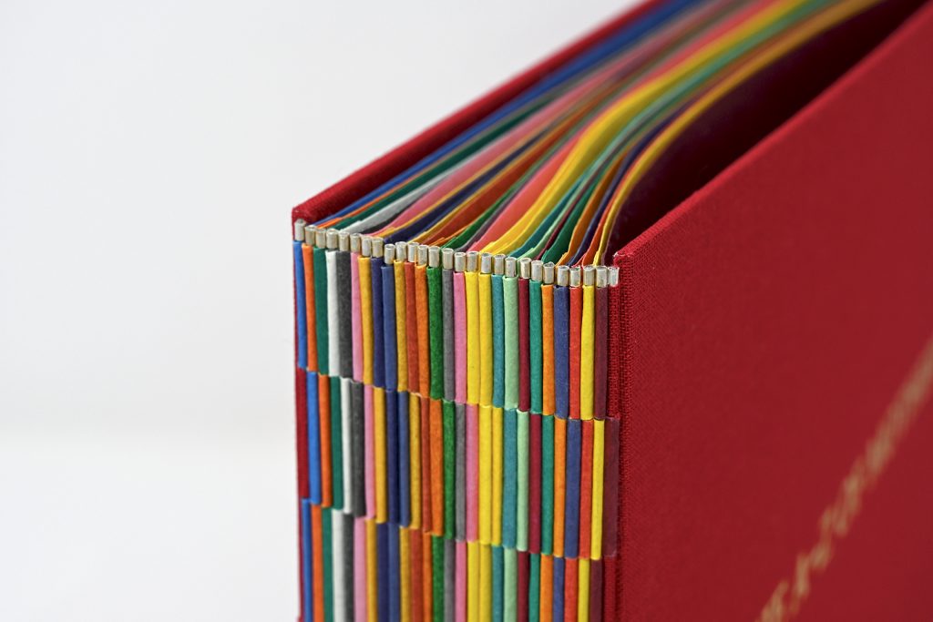 The A-Z of Motherhood documents this journey. Within the pages of the book are 26 words that map the first two years of my new adventure. Each page of handmade paper is dyed with the colour that corresponds to its specific word, amplifying the energy of the emotions. Segments of my ultrasound scans are engraved into the custom wood type, stamped into the surface of the handmade paper, symbolic of the fingerprints of a newborn baby recorded at birth. Titanium rods representing the internal mental and physical strength of a mother hold the binding together, forming not only the crown of the child, but also the soul of the mother. The sterling silver beads symbolize the cord both physical and spiritual that links us eternally to our child. The book is protected by a hand stitched blanket cover made from Faribault Woolen Mills fabric containing the narrative of this journey that began in Minnesota.