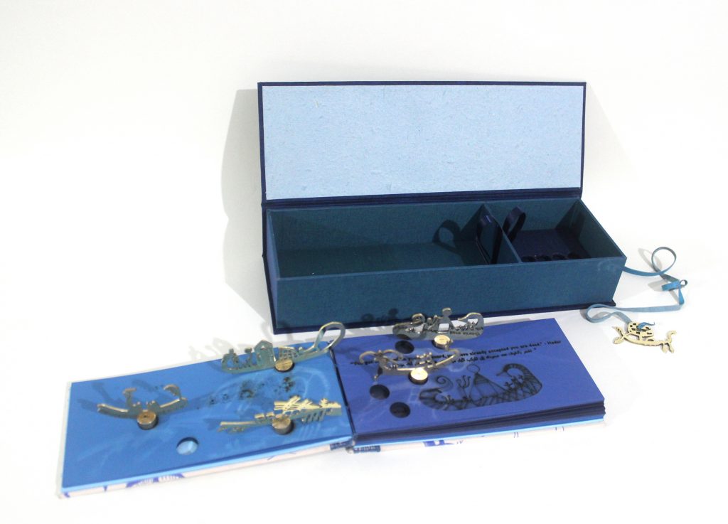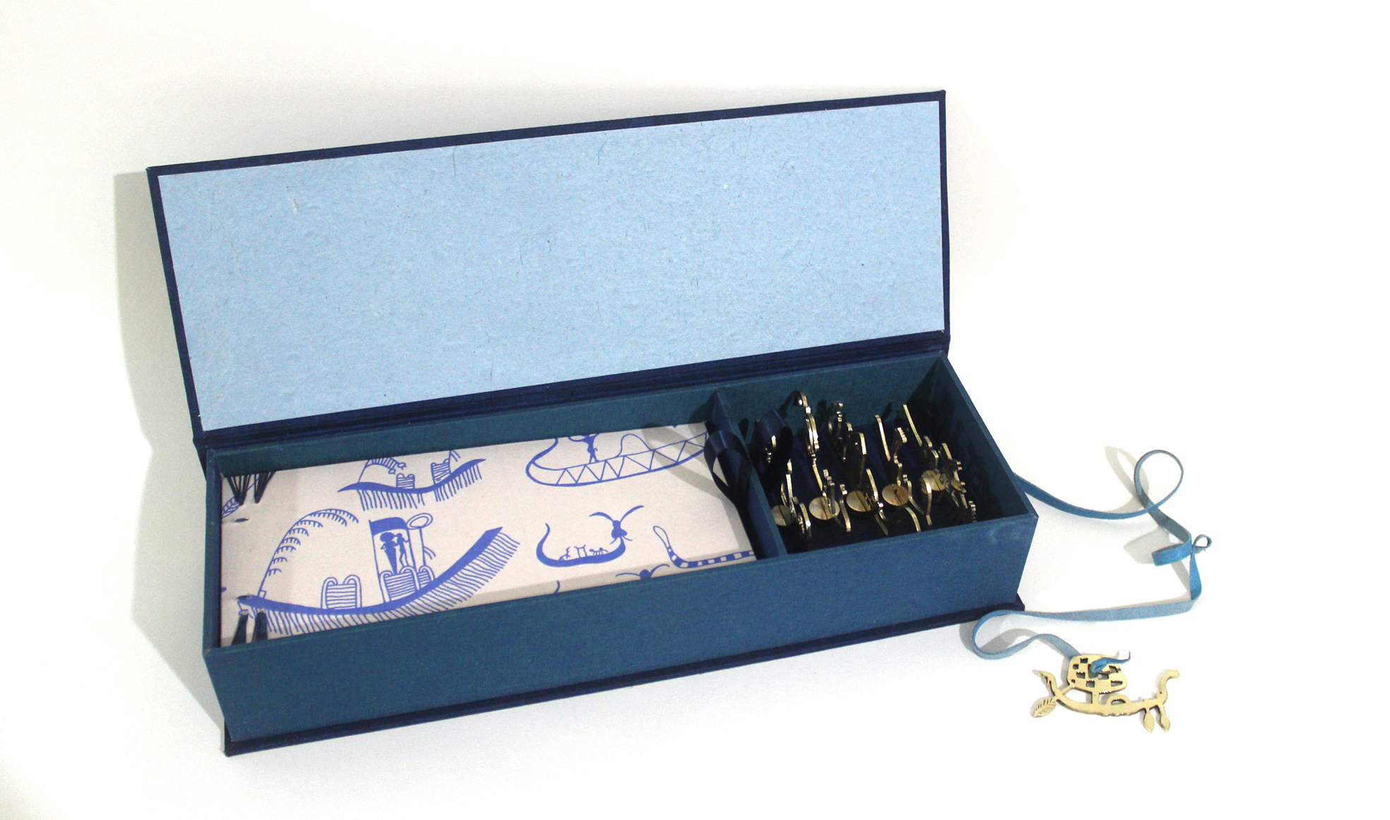 Box size: 14.5 x 5 x 2.5 closed, 14.5 x 10 x 2.5 opened. Book size: 9 x 4.5. Cloth-covered box. Leather wrapping connected to brass cut pieces. Silk-screened book cloth, inkjet printed text, handmade paper, linen thread, book board, museum board, laser-cut Canson paper, Coptic binding, and five brass boats in a compartment. Signed, numbered, and dated by the artist.