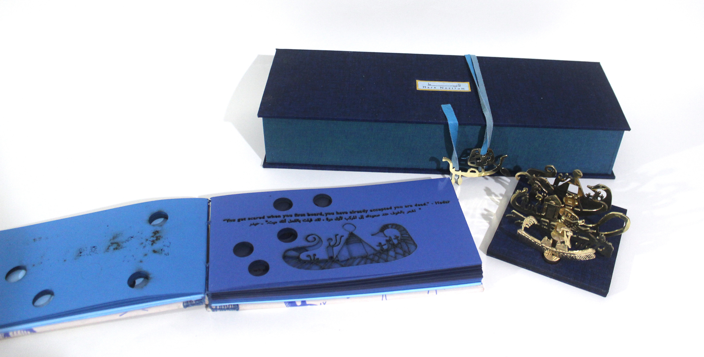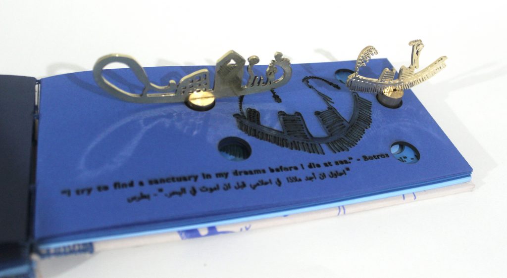 “Mare Nostrum” is a box with two compartments. On the left is a book with images of boats and quotes from migrants who survived the journey of crossing the Mediterranean, reflecting on their experiences. Nine quotes were taken from interviews and video clips where they discussed their experience.