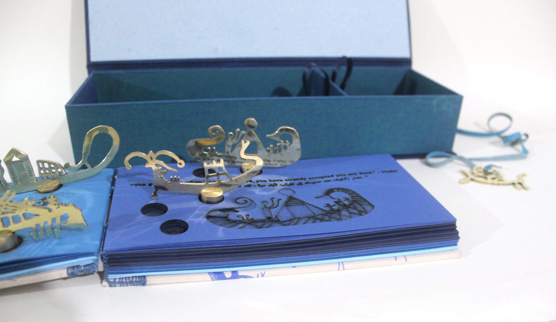 Leather wrapping connected to brass cut pieces. Silk-screened book cloth, inkjet printed text, handmade paper, linen thread, book board, museum board, laser-cut Canson paper, Coptic binding, and five brass boats in a compartment.