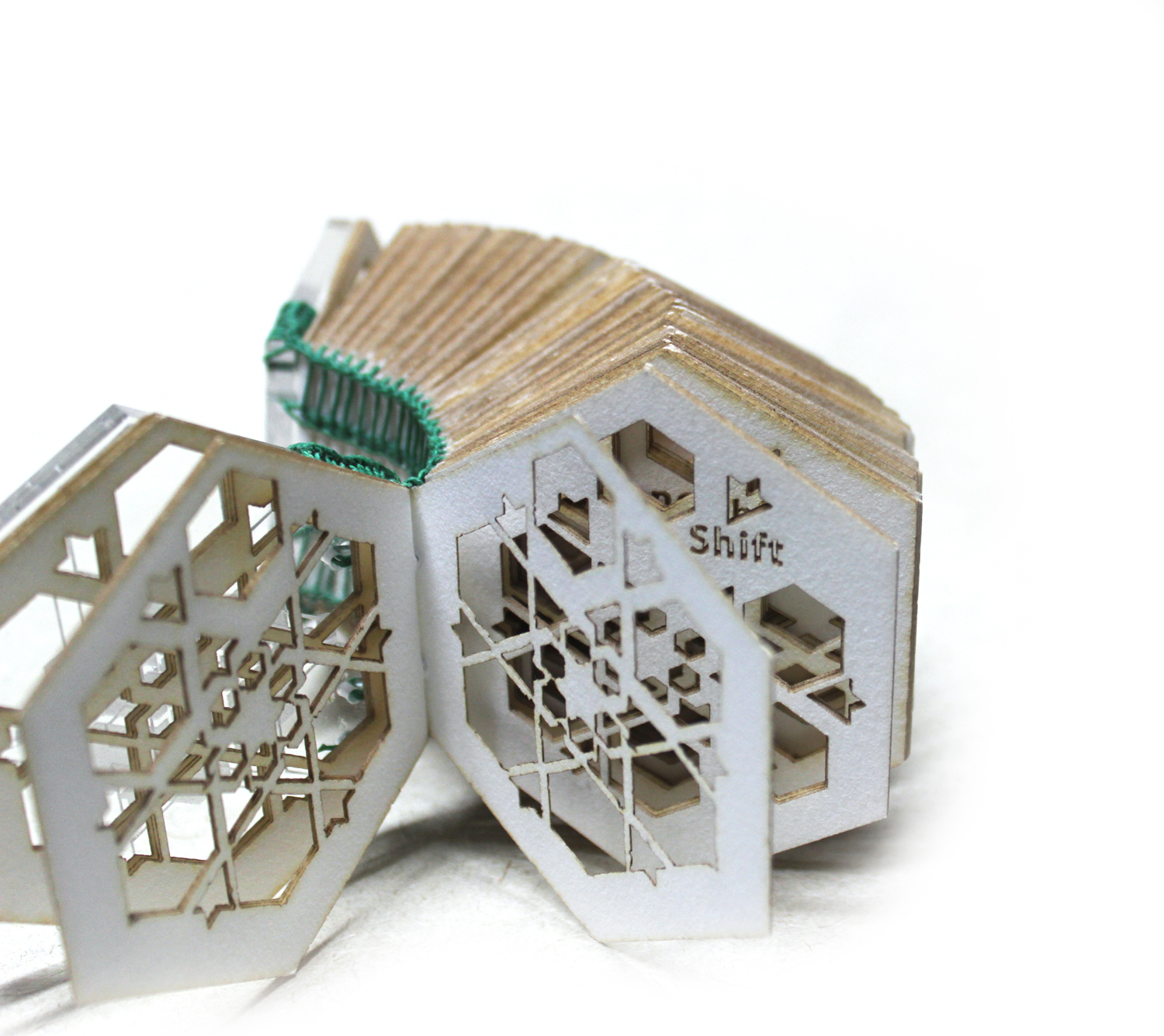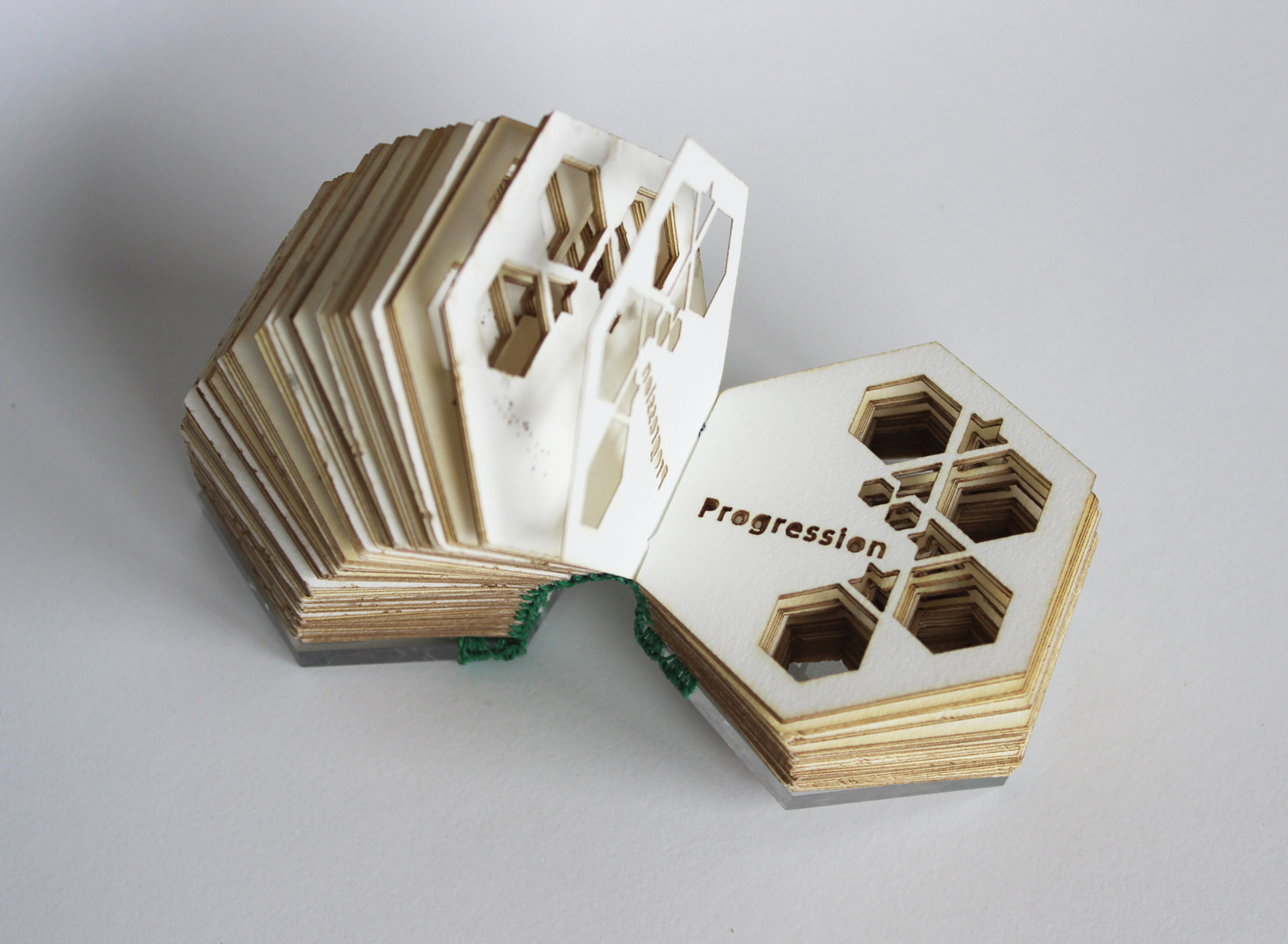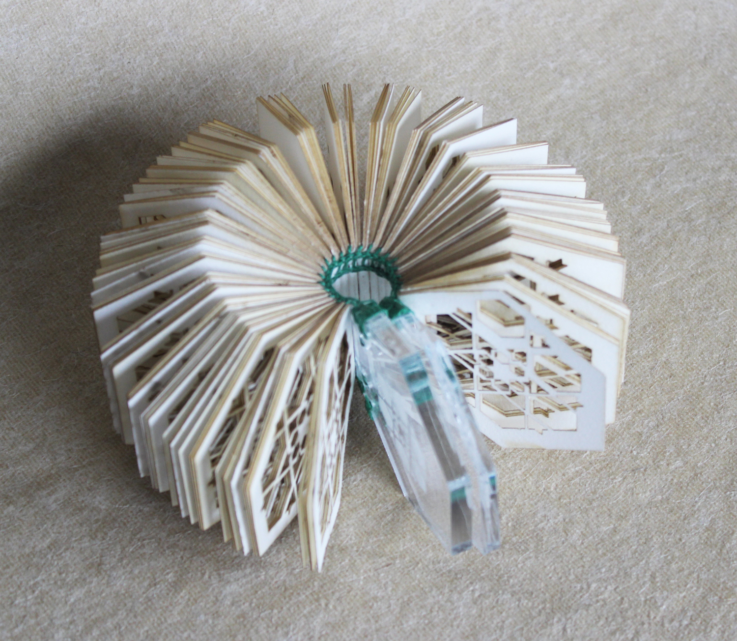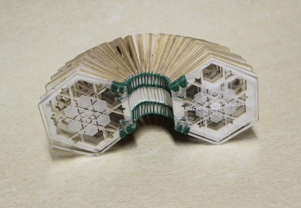 A view of the book showing the laser-engraved plexiglass cover, the endbands, and the laser cut sections.