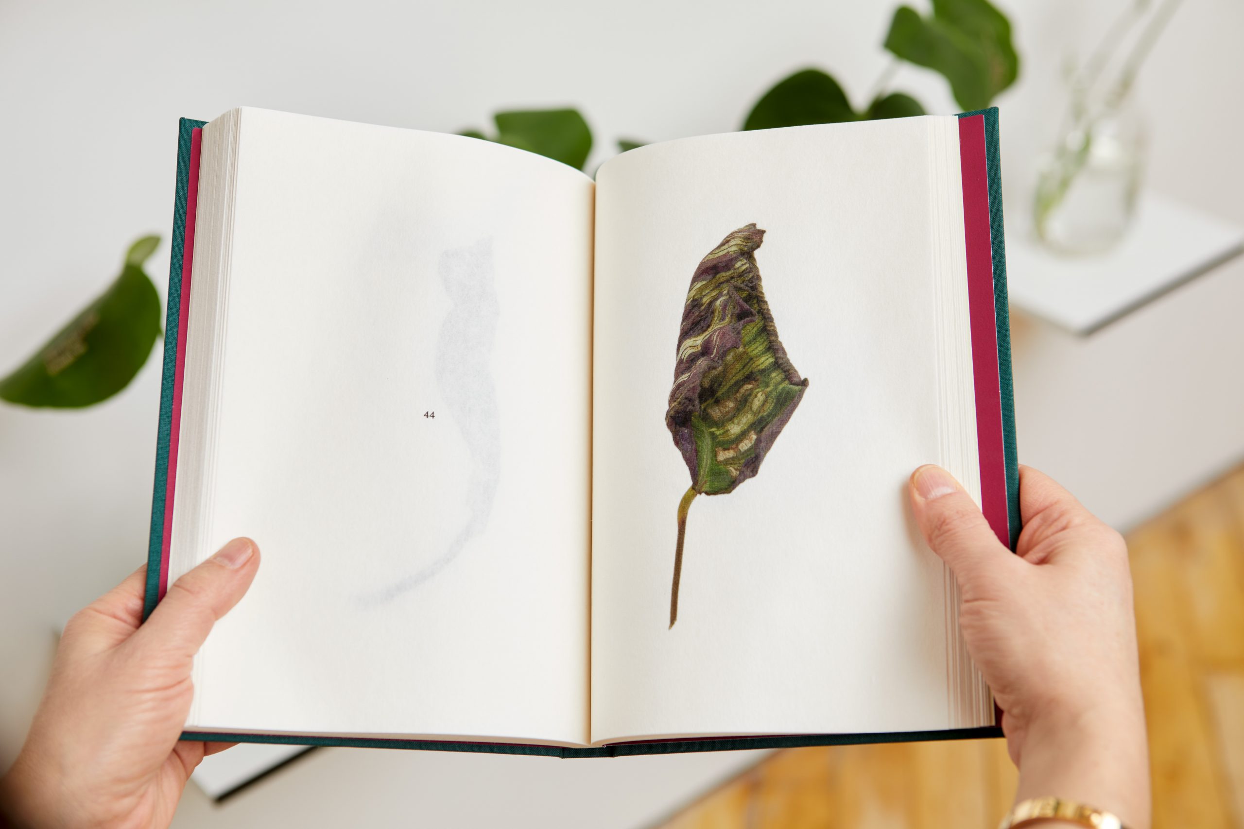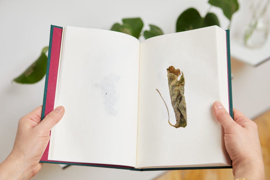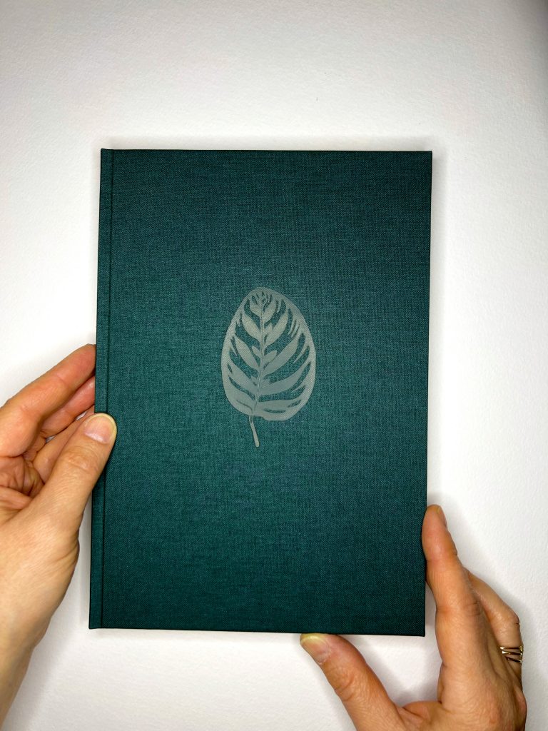 Archival ink jet prints on kozuke paper of letterpress printed Calathea (prayer plant) leaves, hand-bound with embossed cloth cover.