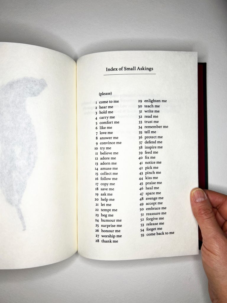 For the past two years, I have been letterpress printing short poetic texts and correspondences onto the leaves and petals of living botanical specimens, contemplating our entanglement with plants and the precarious balance between giving and taking in relation to the “more-than-human” world. Each plant species responds in its own unique way. Some hold onto my words indefinitely, preserving and healing around the outer edges of each passage. Others edit the texts out of themselves slowly over time, leaving letter-shaped cavities where the words were once held. My artist’s book “Spent” documents 55 letterpress printed Calathea (Prayer Plant) leaves, each embossed with a repeated small “asking” and left to decay, transforming and partly obscuring the text in the process. Each leaf serves as a votive offering of sorts; the fulfilment of each request deemed enacted (i.e. “spent”) in its printing. For exhibition purposes, this book may be handled by the public and includes an “Index poem” listing the full collection of numbered small askings and their corresponding texts (for example, “hold me,” “pick me”, “kiss me”, etc).