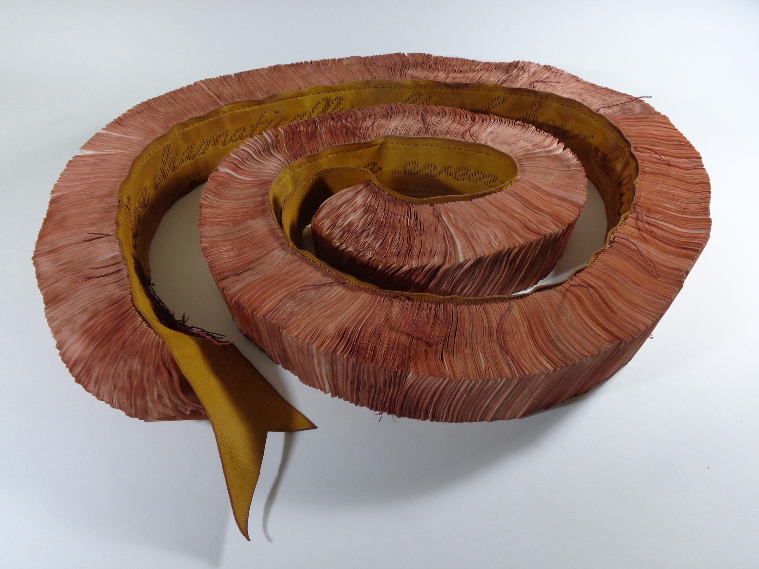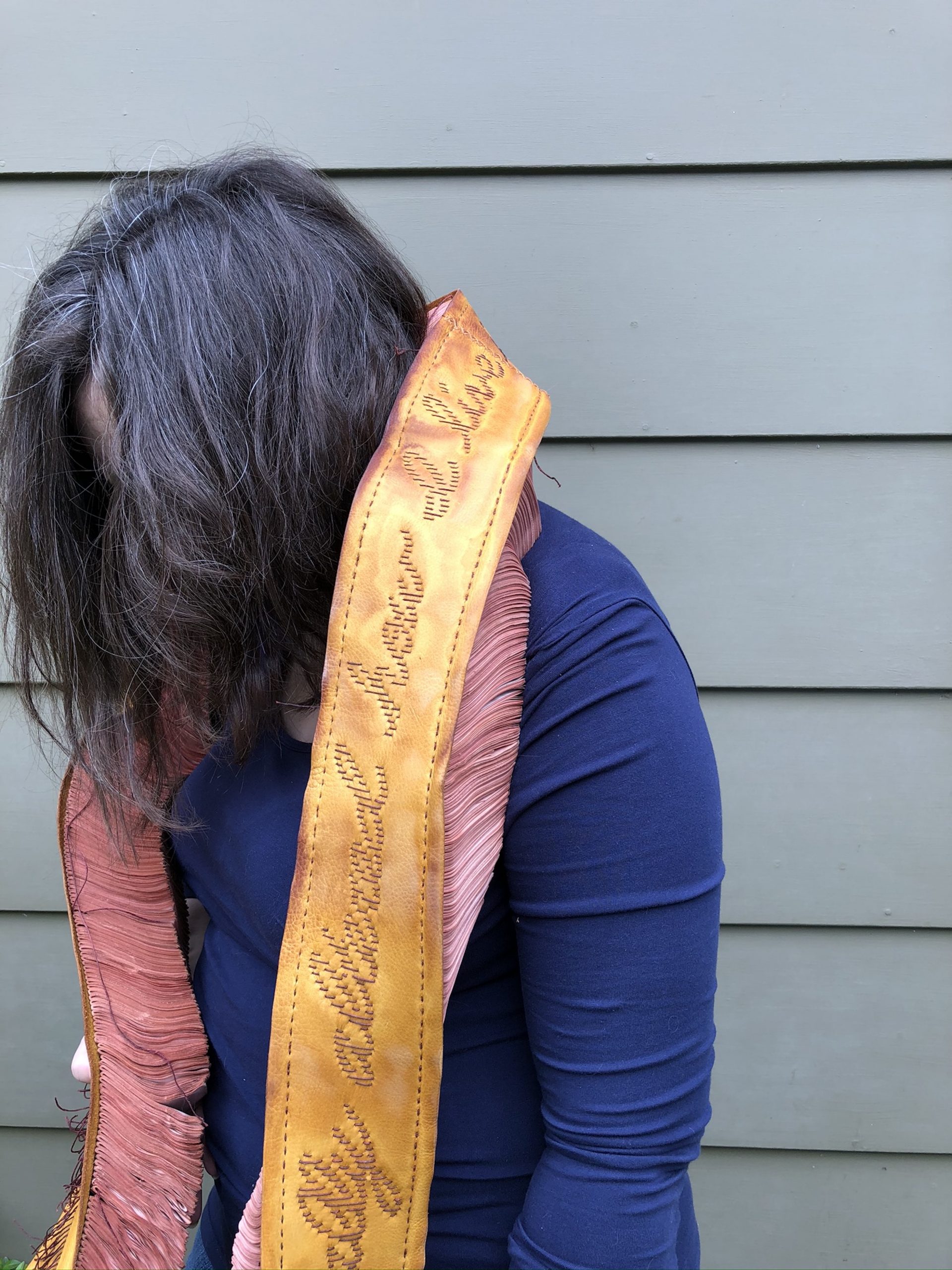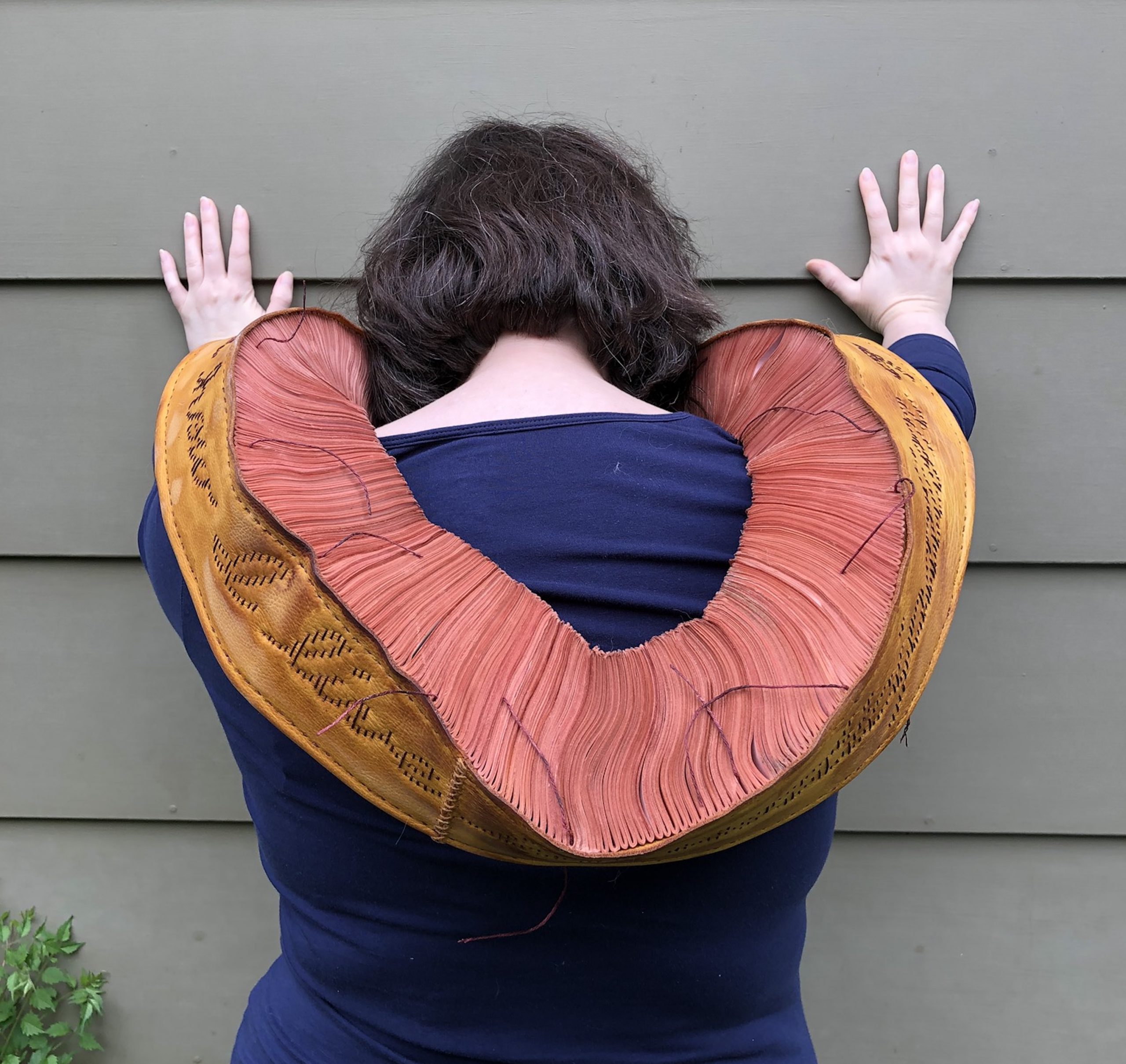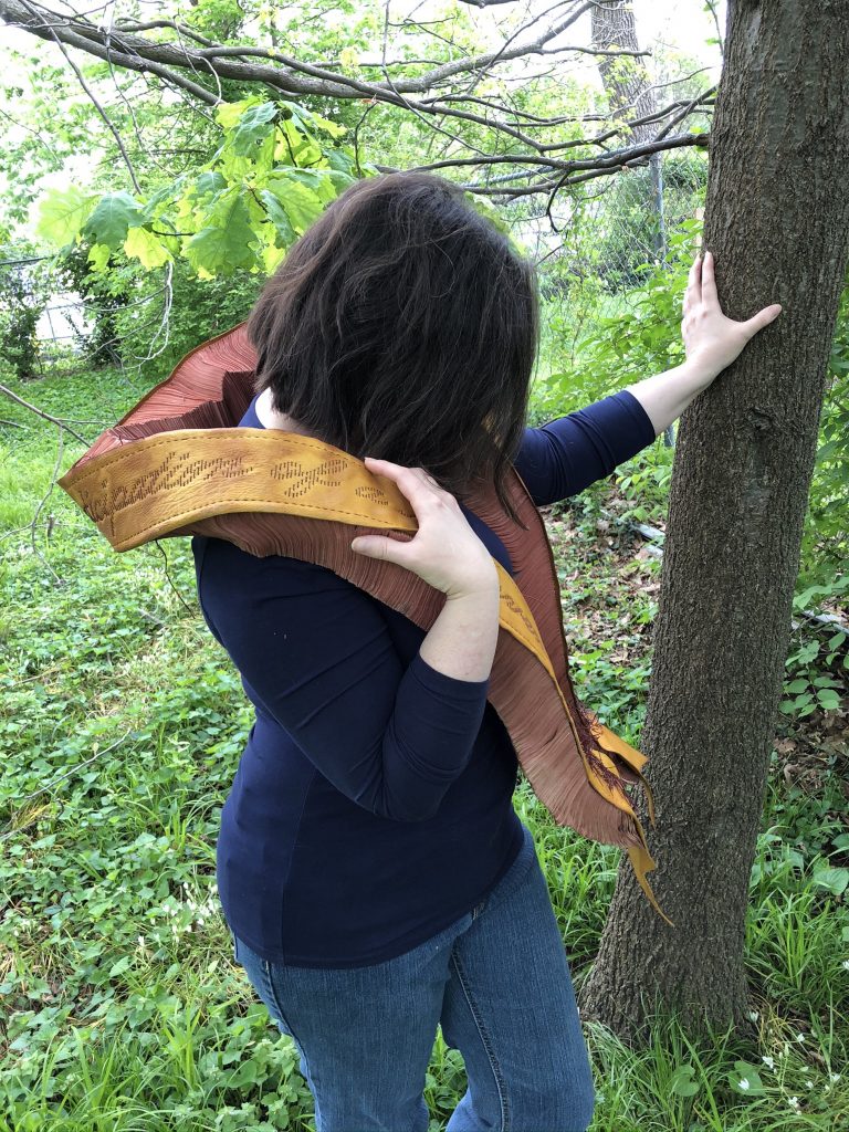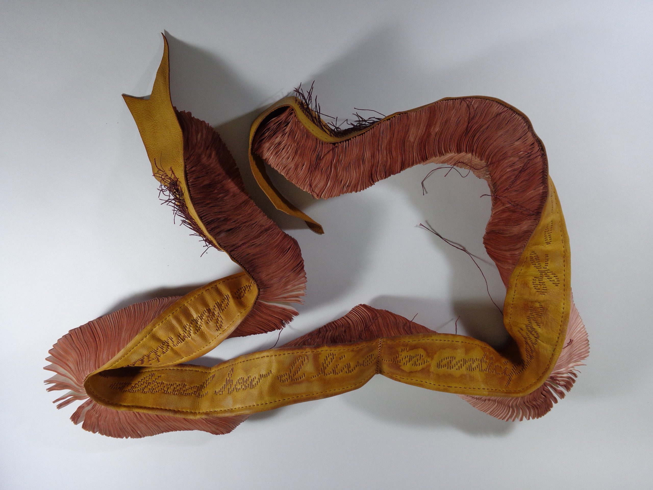 In my artist’s books, I prefer to put the narrative into the form. The concept of book is here, but the story is read in the materials and the way they are put together, rather than through words or illustrations on pages. This piece is intended to be displayed on my body as a symbol of the weight of twenty years of chronic illness in my life, specifically seizures. The text of the book, displayed on the spine in the exposed stitches of the long-stitch binding reads, “I have dramatically altered my life in anticipation of a rare event”. I conceived of this piece when I was approaching the twentieth anniversary of my first seizure. Since the first one happened when I was nineteen years old, this meant that I had now lived more years with seizures than I had without, and I was feeling emotional about this milestone. Those years also represent my entire adult life. The final patina of this piece was achieved through an eight hour soak of the entire book form in an avocado dye bath. The colors and patina of the materials represent aspects of physical illness and injury associated with this condition. These choices along with the frayed strings left in the piece also represent the emotional rawness that I feel when focusing on it in thought or conversation. The risk of seizure is an ever-present looming influence in how I live. It influences decisions large and small, things that those without this condition wouldn’t think about. But as I counted up the days so that I could make a book with a leaf for everyday from that first seizure to the twentieth anniversary, I realized that fourteen seizures during that time actually made it a fairly rare event. During the 14,612 days that had elapsed, less than one percent of them had included a seizure. Which is ironic for the influence it wields on me.