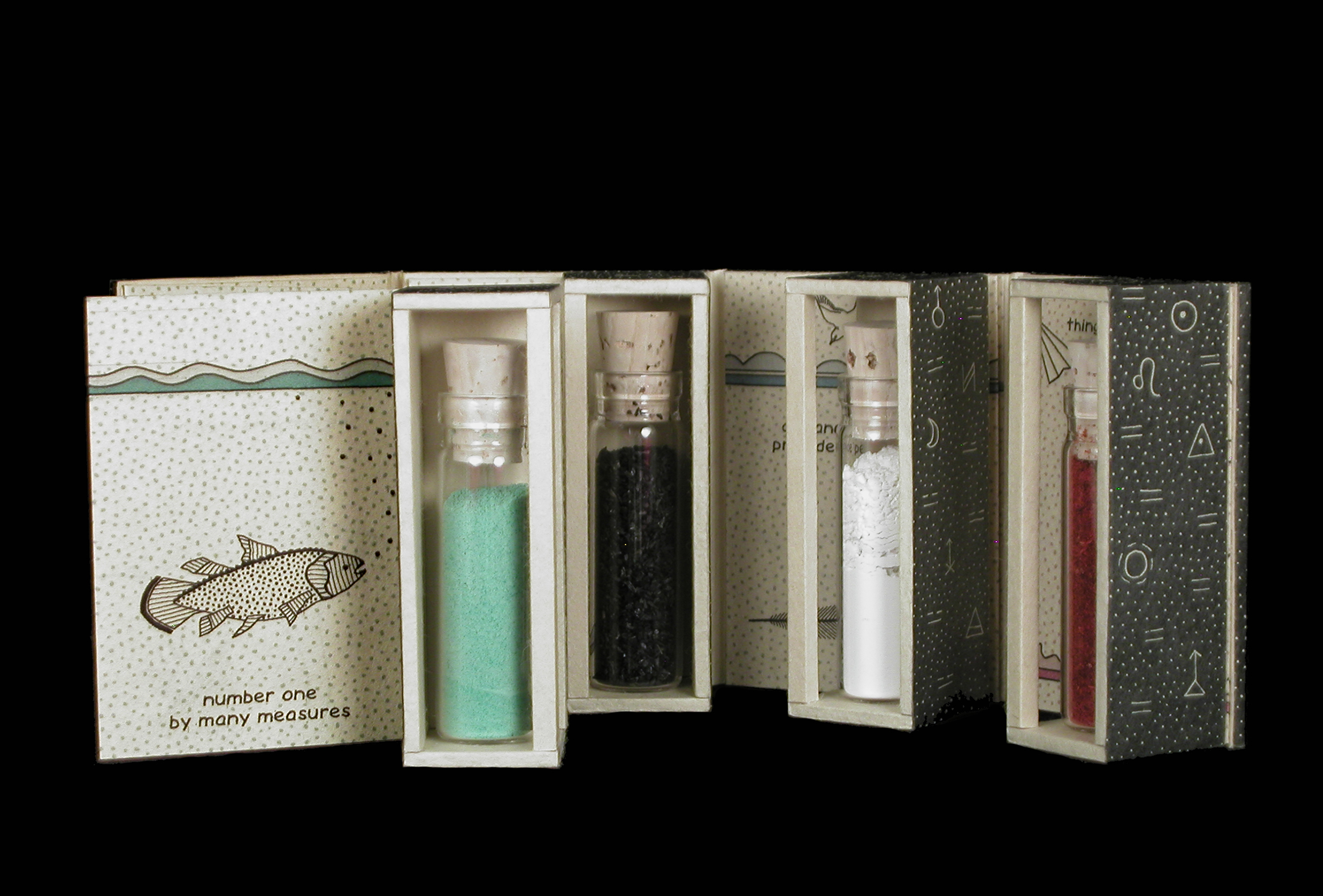 Artist’s book of 4 boxes, with vials of dust attached to archival inkjet-printed accordion Sakamoto paper pages. Book folds up into a small, tall cube with magnetic closures. Boxes and 4-sided cover constructed from bookbinder’s board covered with Intaglio-printed kozo paper. Edition of 44.