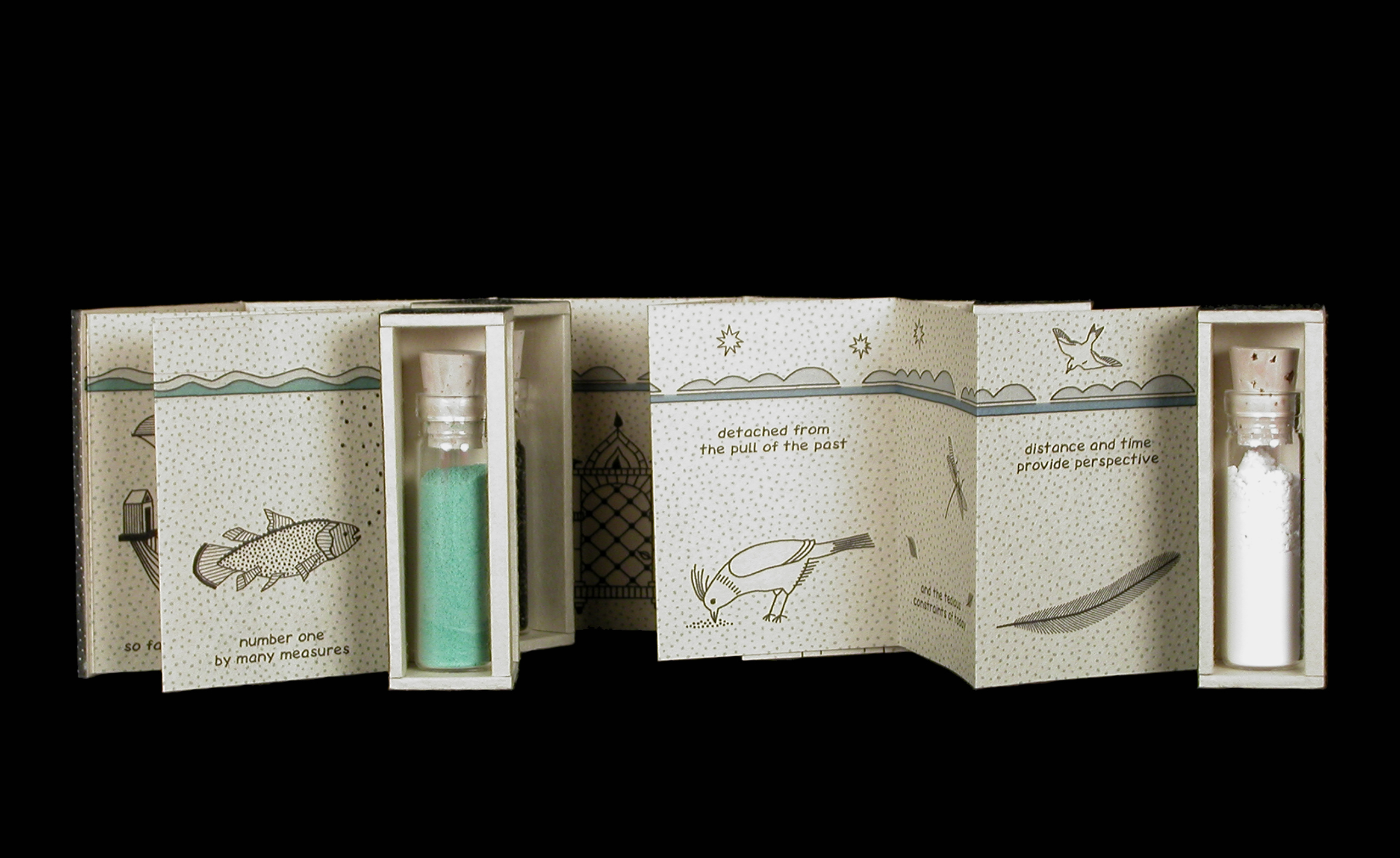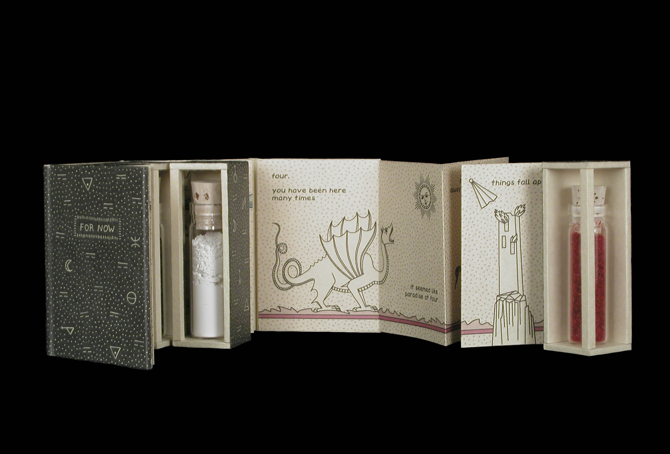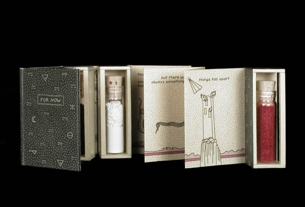 With each of my artist’s books I try to use a different box structure to challenge myself. Sometimes that structure is the starting point, as it was with For Now. To include dust, I decided to design a book comprised of four two-sided boxes each holding a separate vial of dust, attached to four accordion-folded pages. How to close this up into a concise whole presented many structural problems, which I worked out with a series of mock-ups.