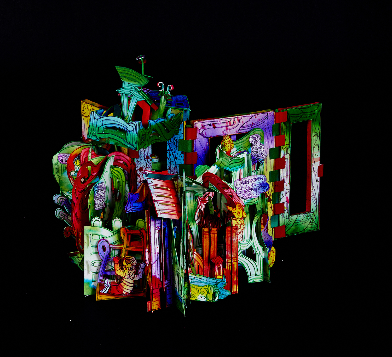 This unique carousel pop-up book is made from over two hundred single sections joined with dovetail hinges and interlocking units. There are no folds and so no spring action or paper fatigue. The accordion design swings into a circle so that the final spread touches the open back cover.