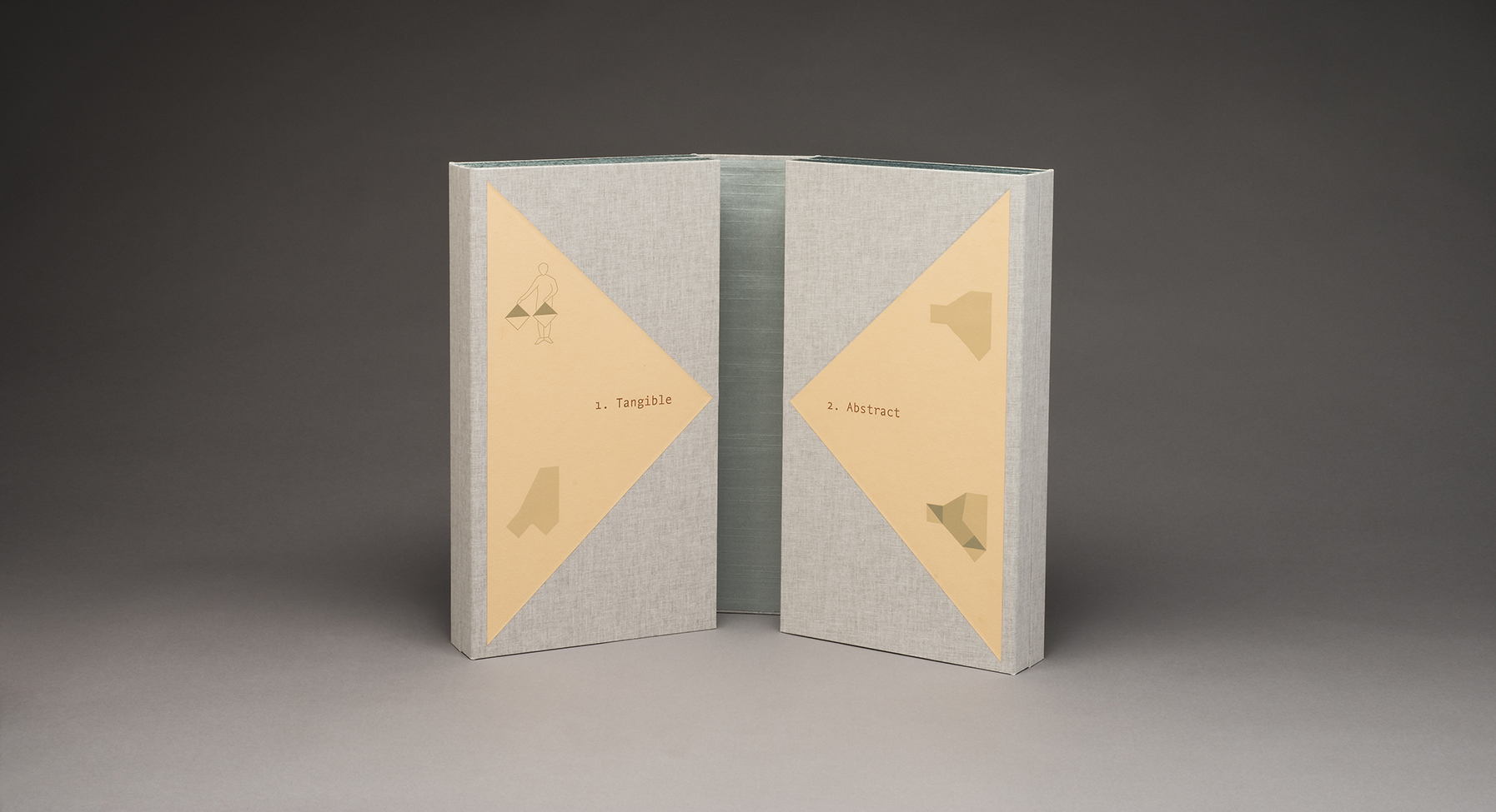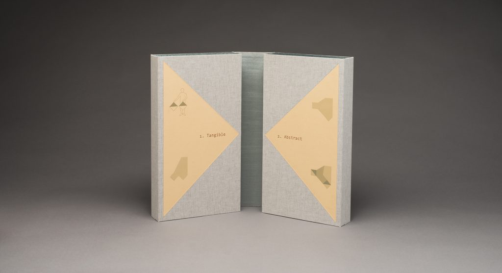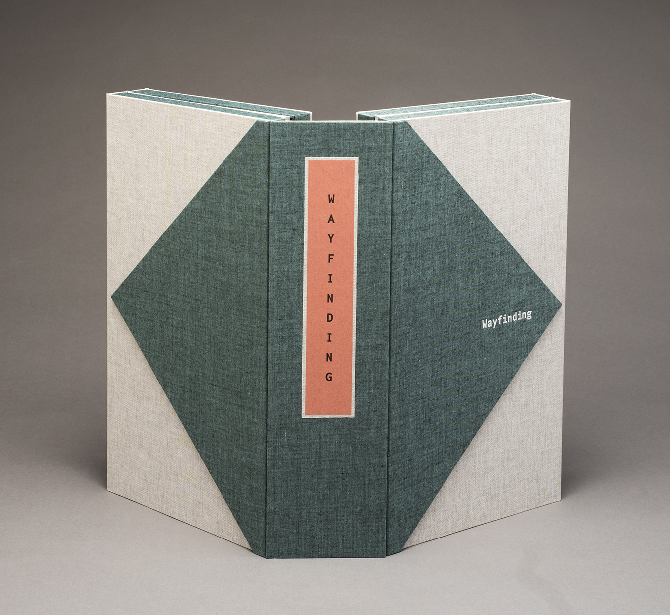 Wayfinding was written, illustrated and designed by Julie Chen. It was inspired by a series of conversations between Julie Chen and her daughter Eleanor Chen-Ranstrom about pattern texture, perception and learning. This book consists of a series of four box trays that are connected by a series of panels. The top layer contains two trays containing cast paper sheets and two booklets assembled in dragon scale binding format. The first booklet focuses on the perspective of a physical learner and the second booklet is written from the perspective of a mental learner. When the book is opened to the second layer of trays and panels, the translation of an alphabet from gesture to symbol to three-dimensional abstract shapes is revealed, giving the reader the tools needed to decipher some of the abstract elements found throughout the book.