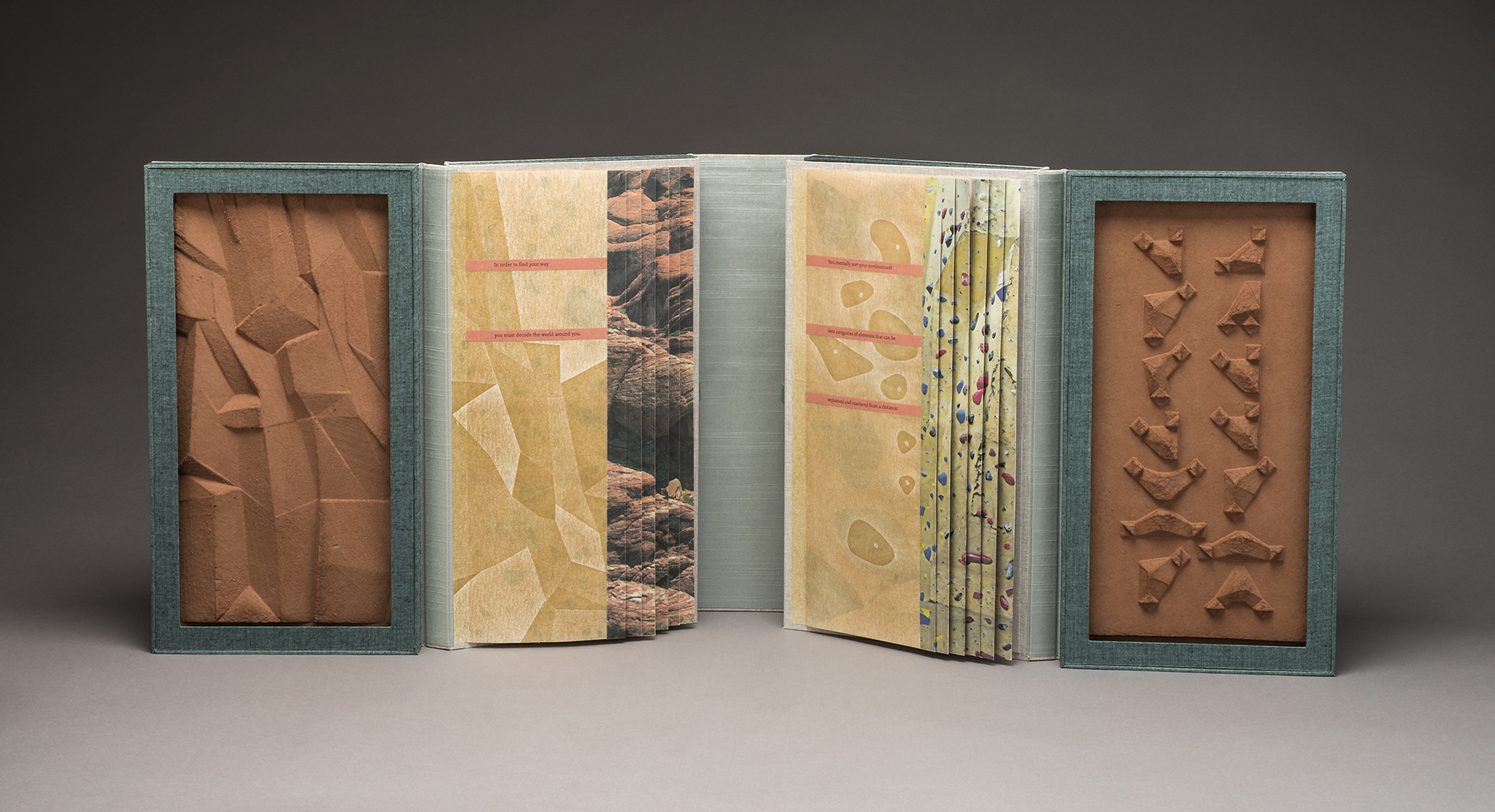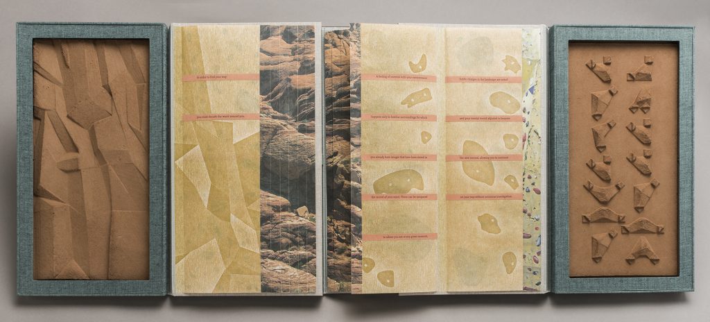 Wayfinding examines the relationship between physical and mental learning through the context of navigation through time and space. The piece focuses the reader’s experience on the physicality of the book as object through the inclusion of three- dimensional cast paper sheets and pages of handmade paper that rattle when turned. A 3-dimensional alphabet abstracted from diagrams of flag semaphore addresses the activities of signaling and translation and how information is taken in by all the senses and not just through the eyes.