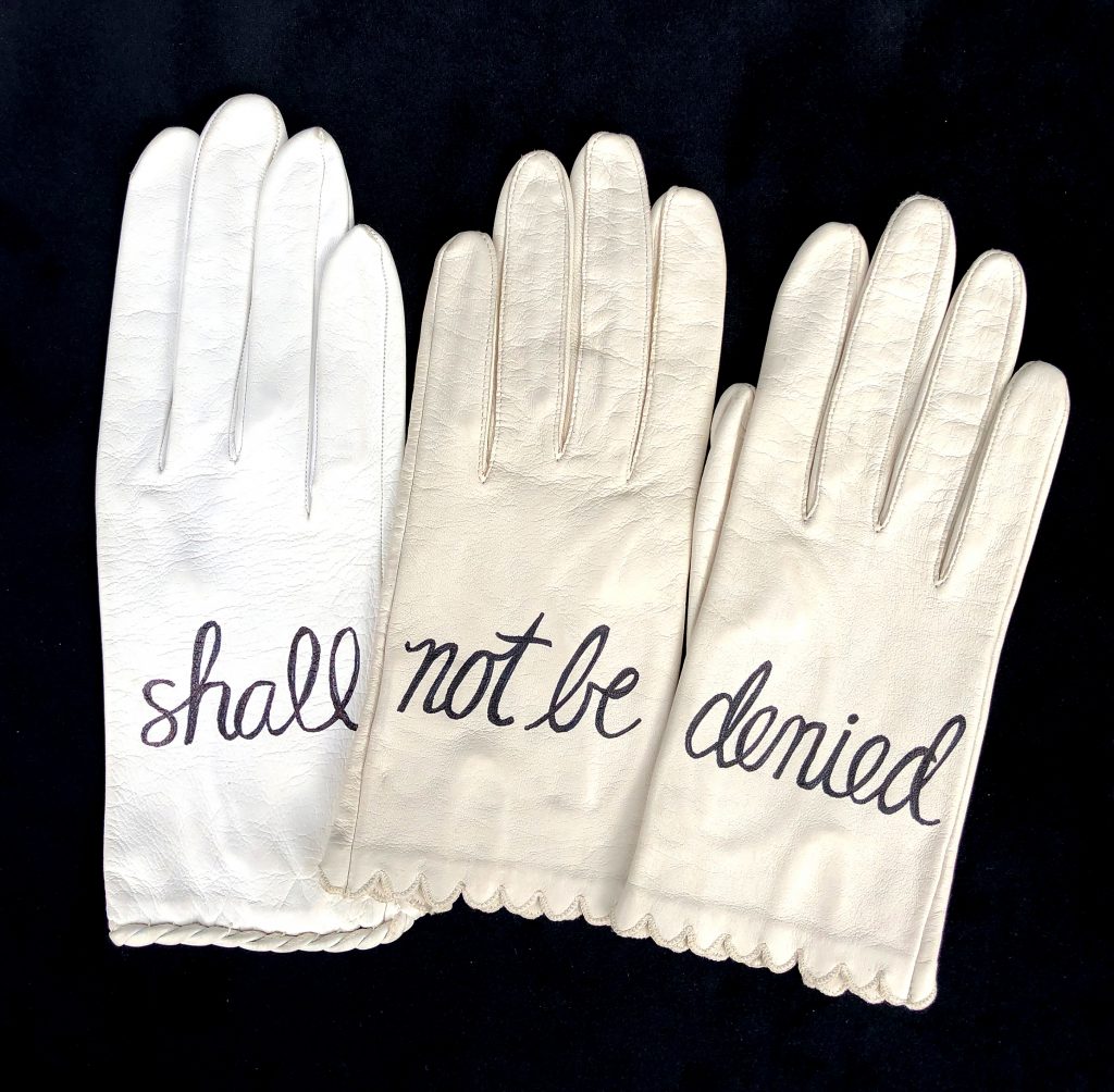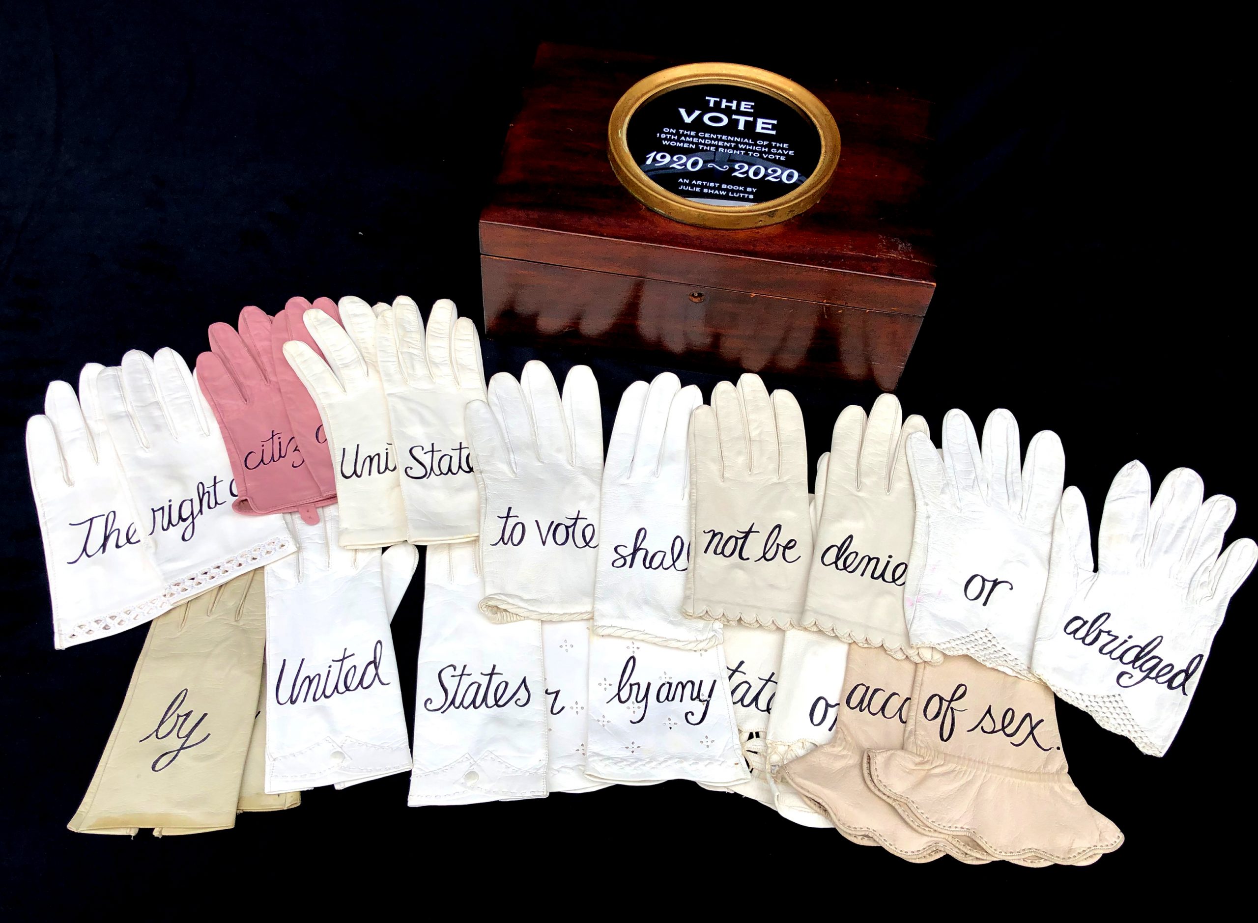 My book was created using a vintage wooden box where the 22 pages are housed. The pages are vintage kid leather gloves. Many of these gloves were given to me by a friend whose mother had actually worn them as she cast her vote.