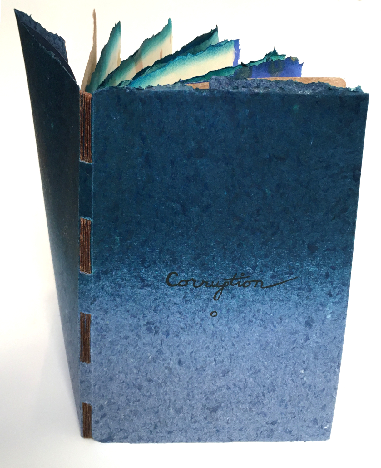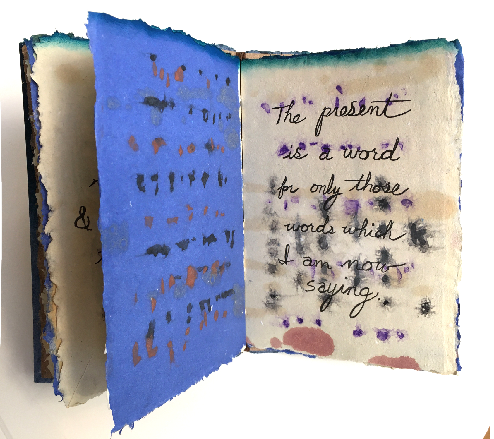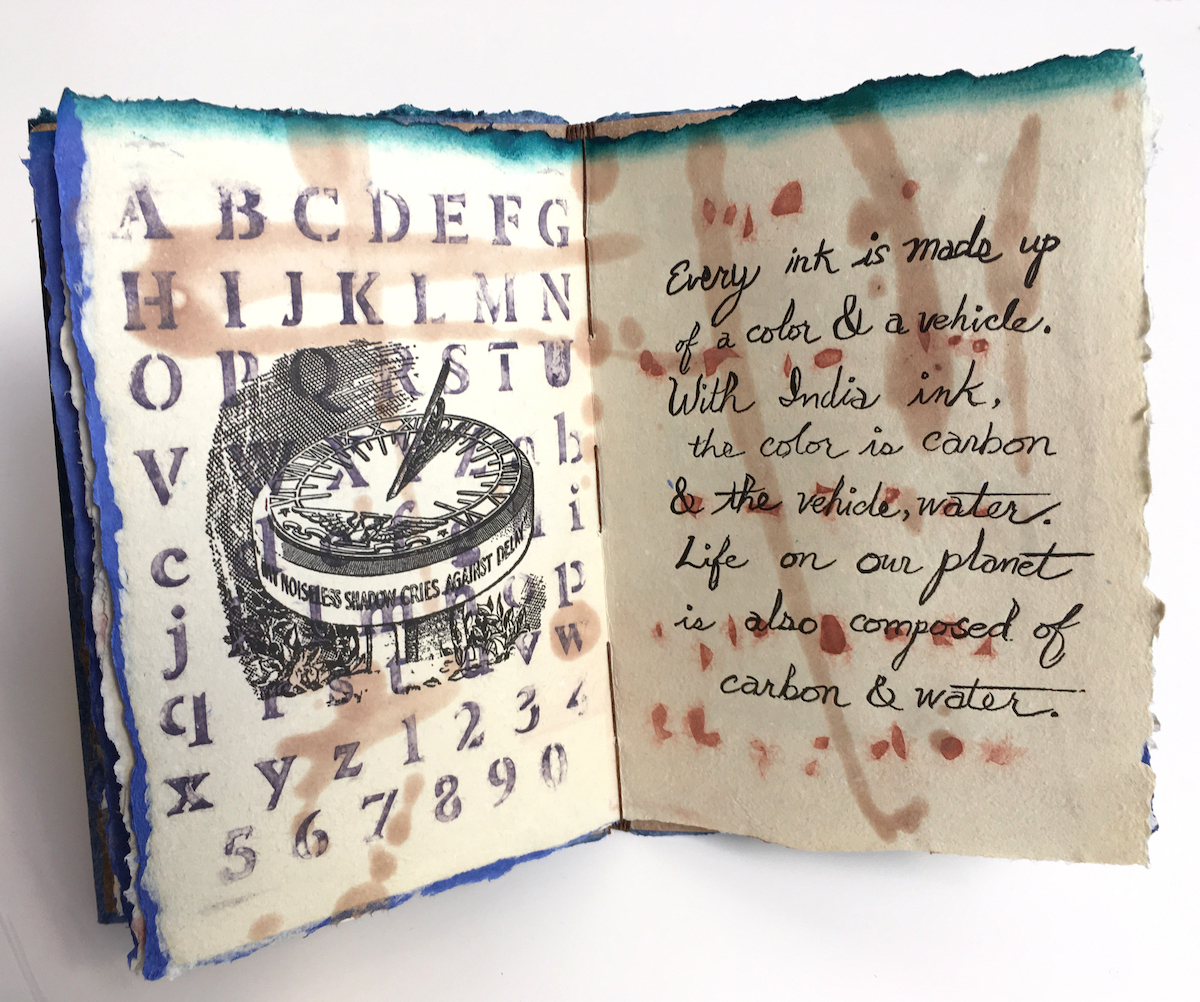 Photopolymer relief plates and handset letterpress type on artist-made cotton paper with pulp painting. Folded pages are encased in covers of handmade paper with a woodblock printed blend, and bound with a long-stitch.