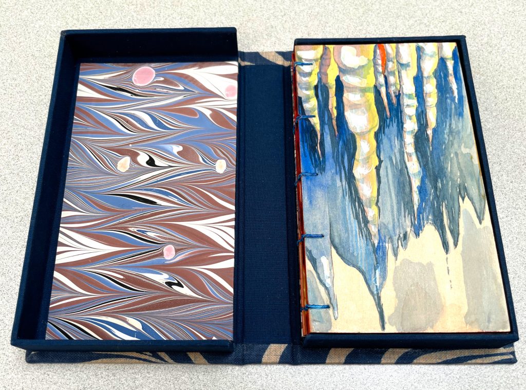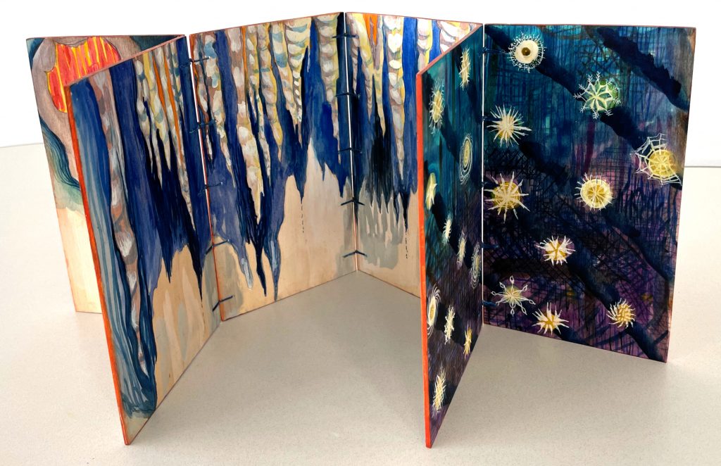 Watercolor, gouache, ink on basswood pages, sewn binding, accordion with two gatefolds.