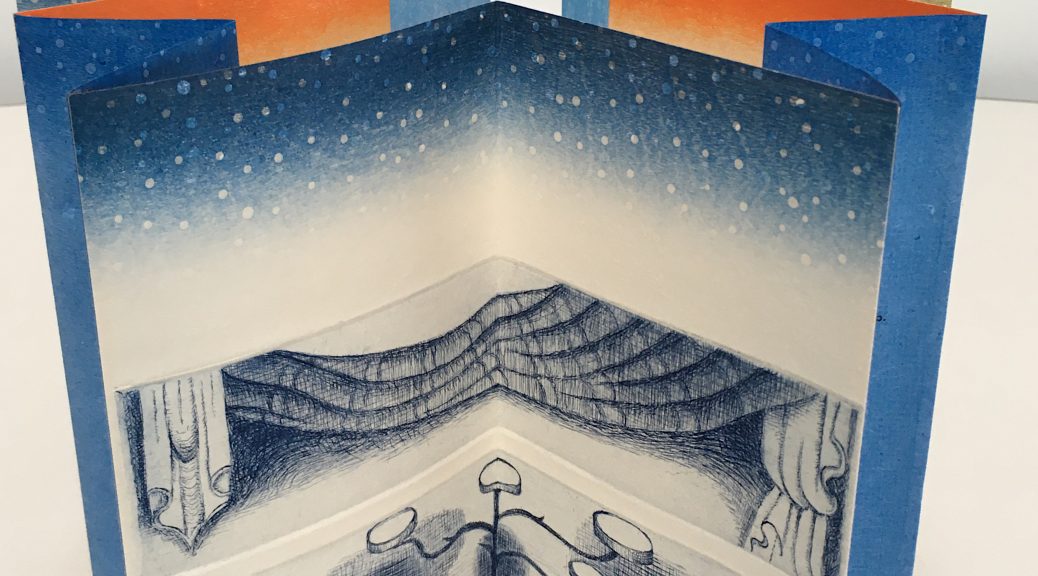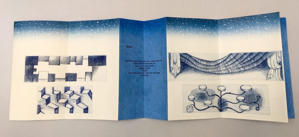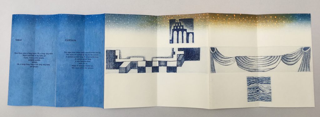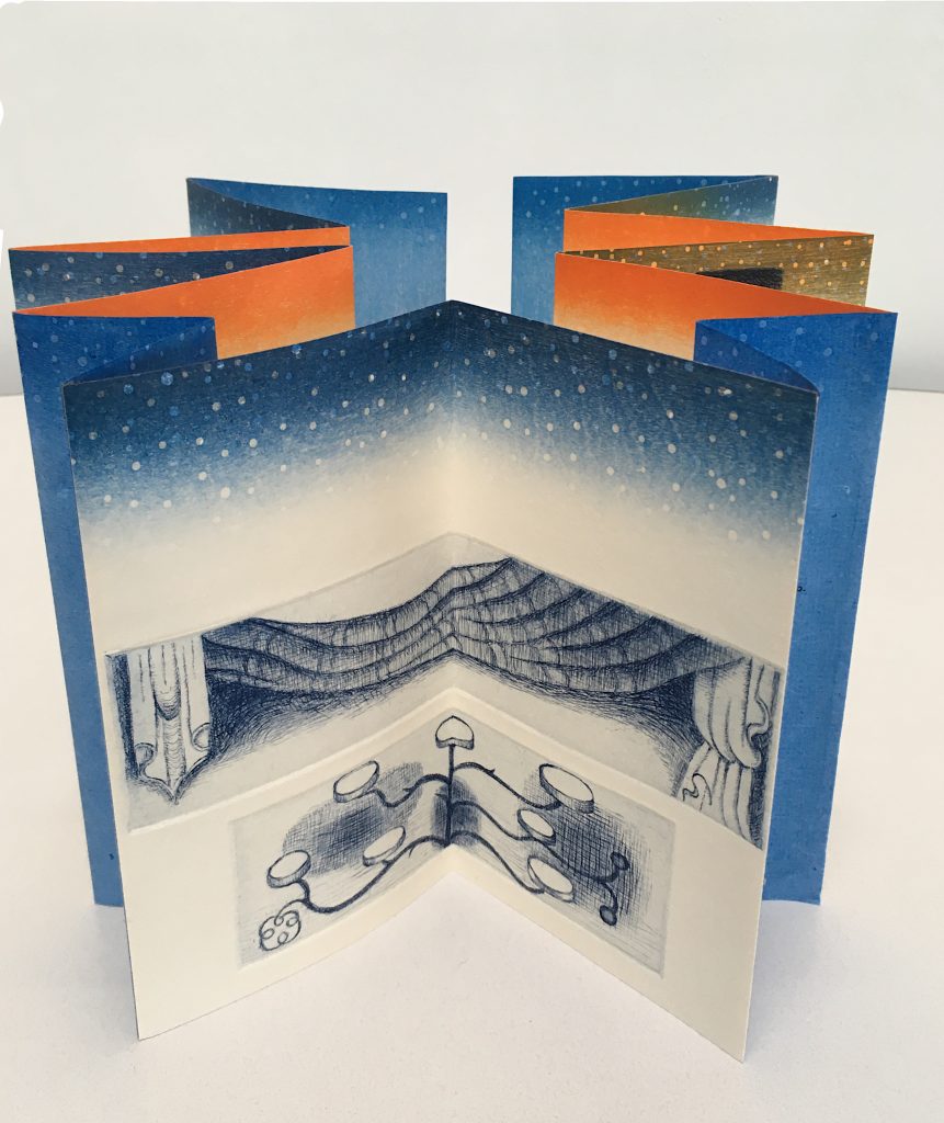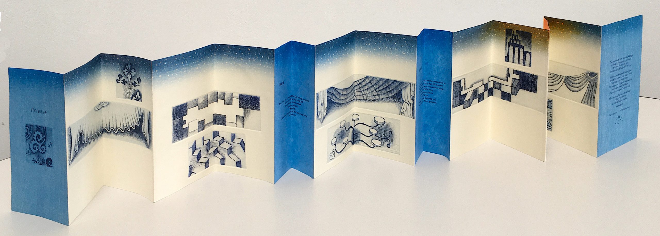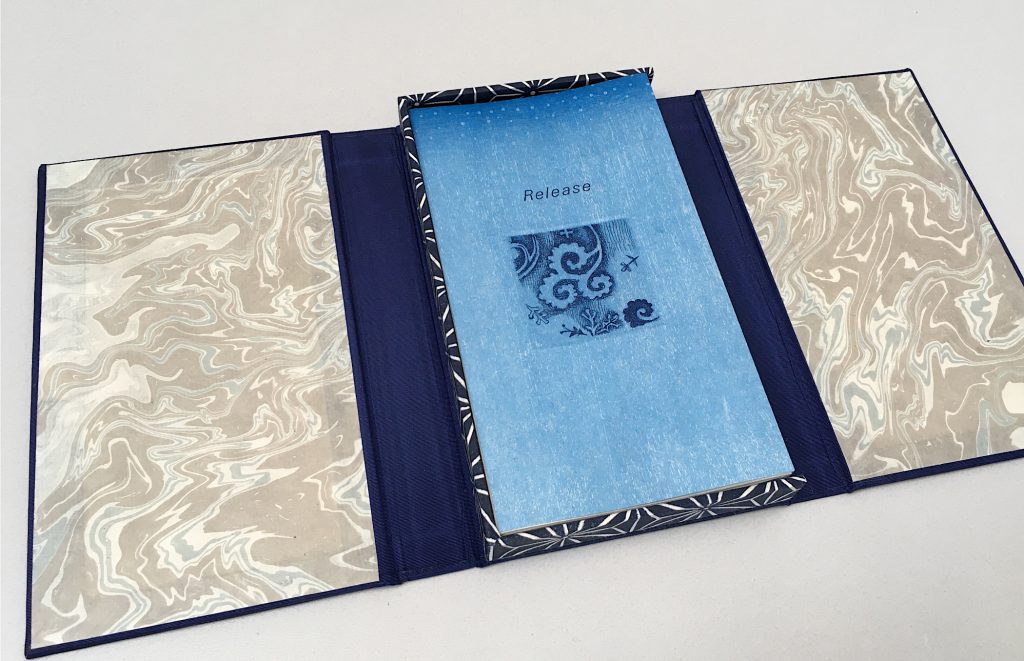 Etching, woodcut, and letterpress on various Japanese Nishinouchi papers, and artist-made blue kozo. Box of covered boards. Clamshell box with cradle 11.25 x 8 x 2.25″ closed.