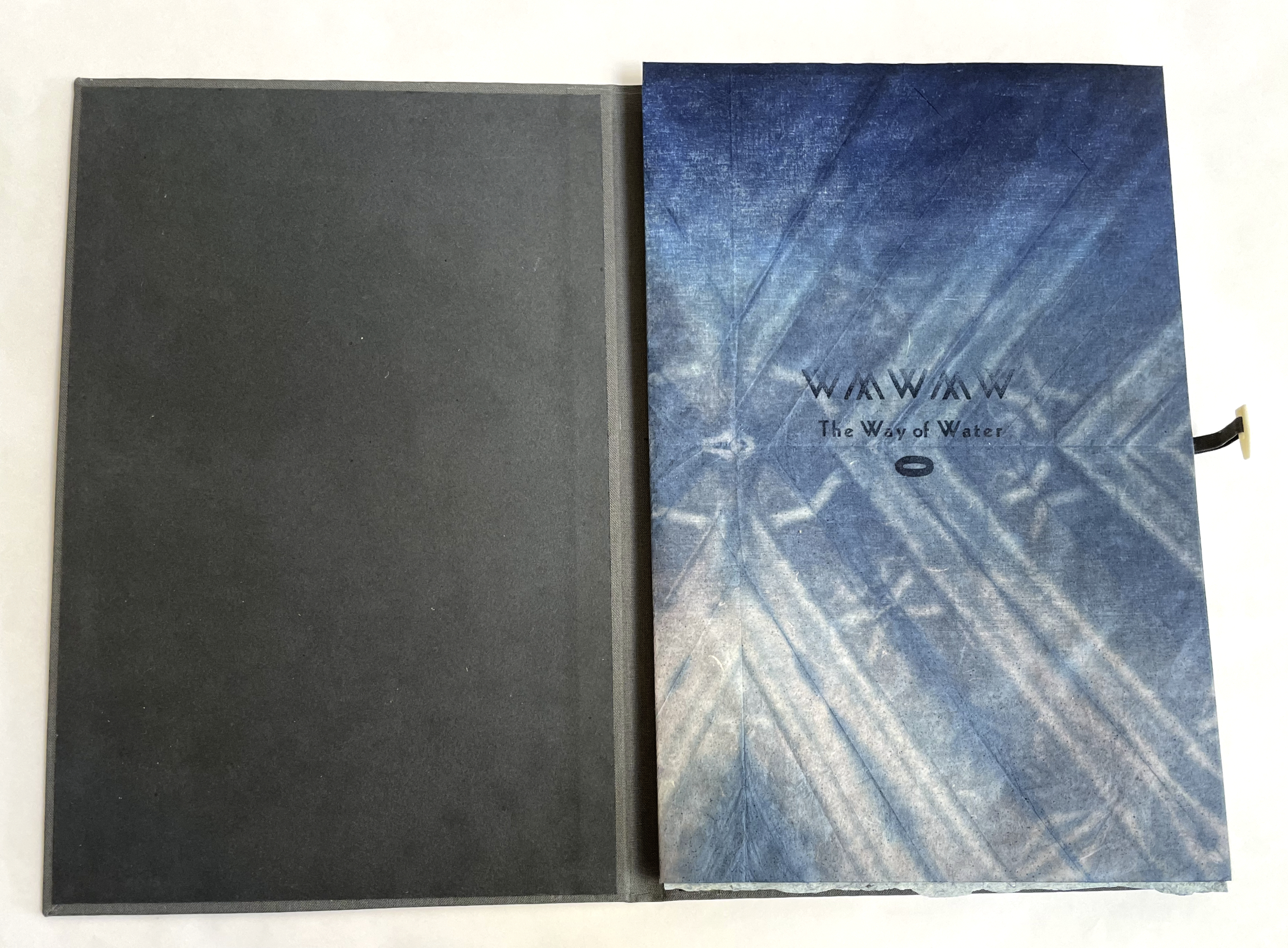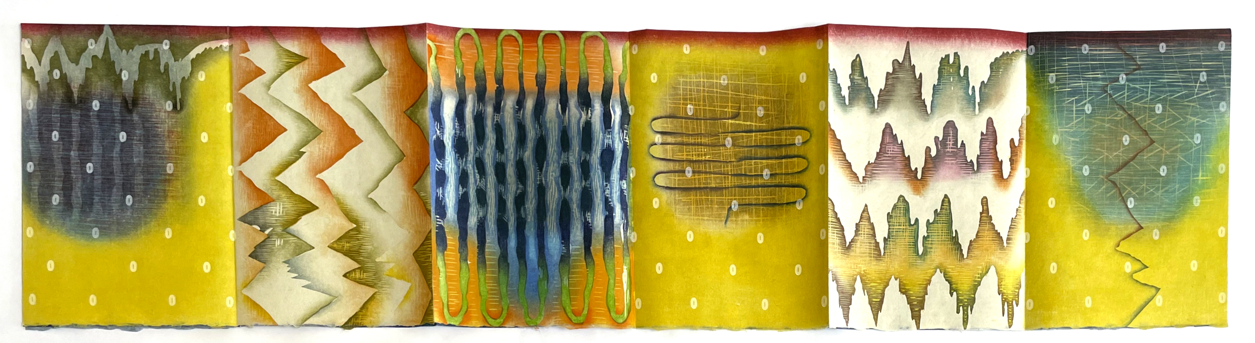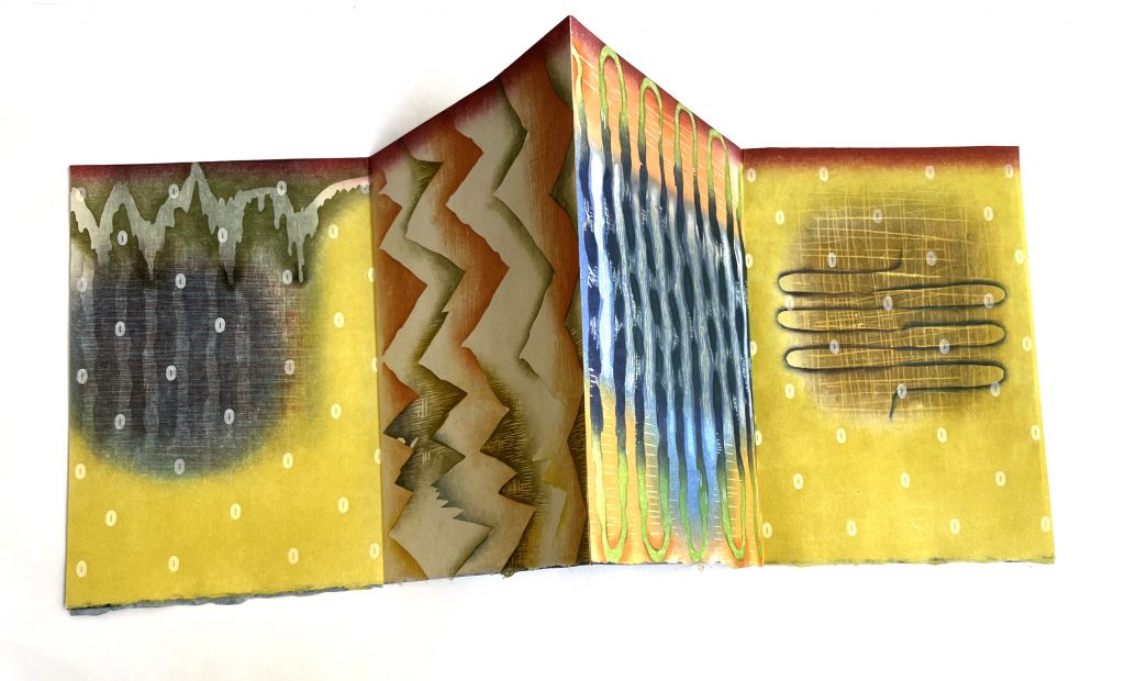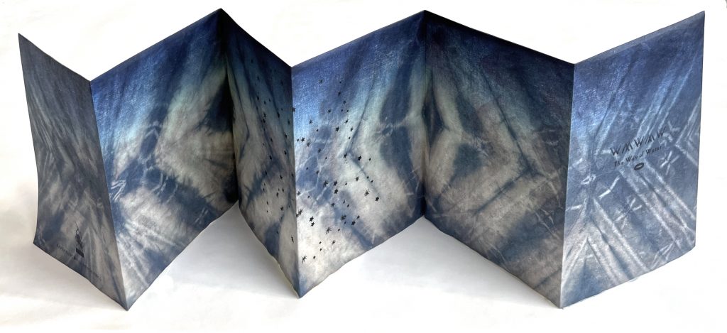 Woodcut, letterpress on Japanese Nishinouchi, with shibori dyed kozo paper backing sheet with woodblock.