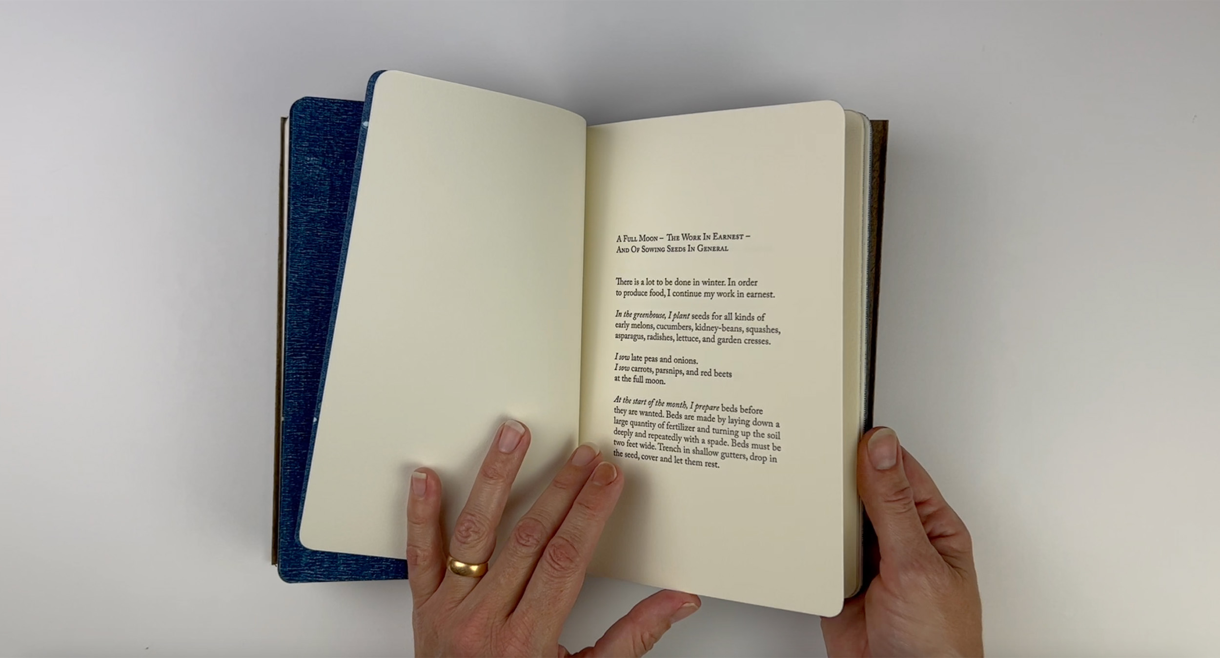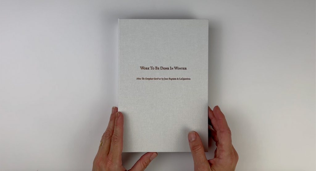 ‘Work To Be Done In Winter’ is an artist book inspired by The Compleat Gard’ner, written by Jean de LaQuintinie and published posthumously in 1699. I discovered this book while conducting research in the Landscape and Architecture Collection at the Fisher Fine Arts Library in Philadelphia, PA in 2019, as a visiting artist at Common Press. My interest in the collection centered on how humans shaped the world through the aesthetics and functions of gardens in the 17th and 18th centuries. What captured my imagination was how the author’s gardening experience lead to this book. Jean de LaQuintinie designed and built the king’s vegetable garden at Versaille, transforming land that was considered not suitable for farming. He developed cultivation techniques for off-season food production, providing fruit and vegetables year around. His advancements contributed to the improvement of the cultivation of fruit trees and their pruning. Pruning illustrations from Jean de LaQuintine’s book influenced my ink drawings of trees. The text was inspired by the author’s detailed instructions on the work to be done in the garden in order to produce fruit and vegetables all year round. Funding for this project was provided by common press at the University of Pennsylvania, Philadelphia Center for the Book and the Humanities Center at University of Alabama in Huntsville. The research for work to be done in winter began in 2019, was put on hold due to the pandemic, and then designed, printed and bound in 2023 by Katie Baldwin.