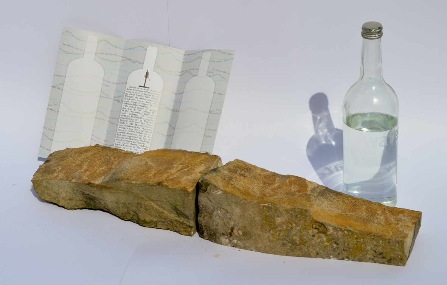 The installation/interaction opens up ways of delivering a message, transience, and layering of heritage. This work combines different elements and media: a leaflet, two local stones, a bottle of freshly drawn water, and action.