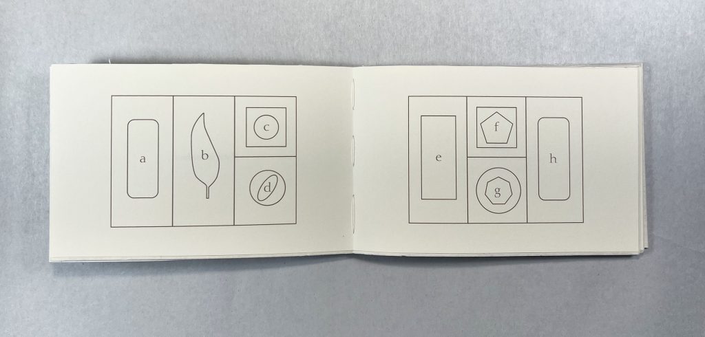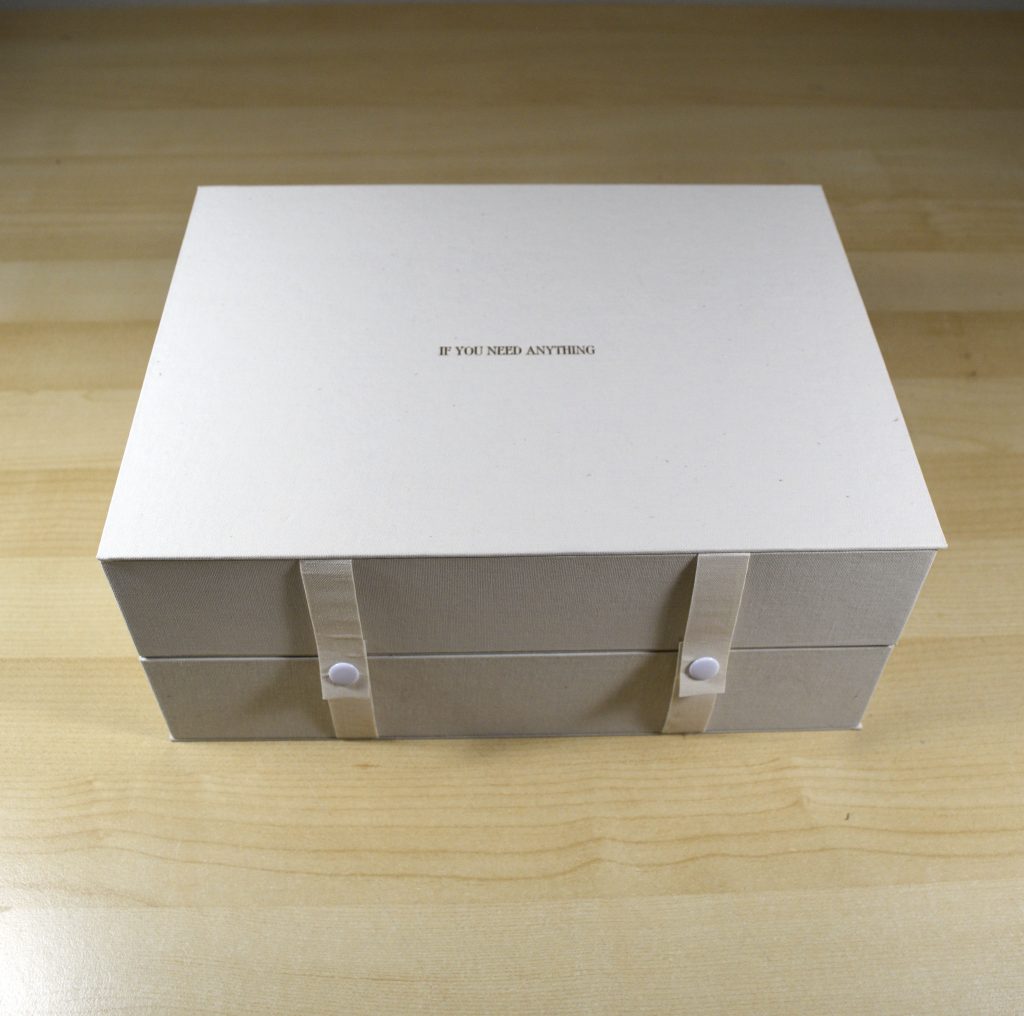 Inkjet, gold-foil stamped booklet and labels, collected objects in compartmented box.