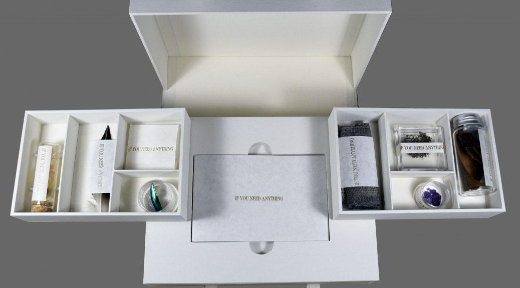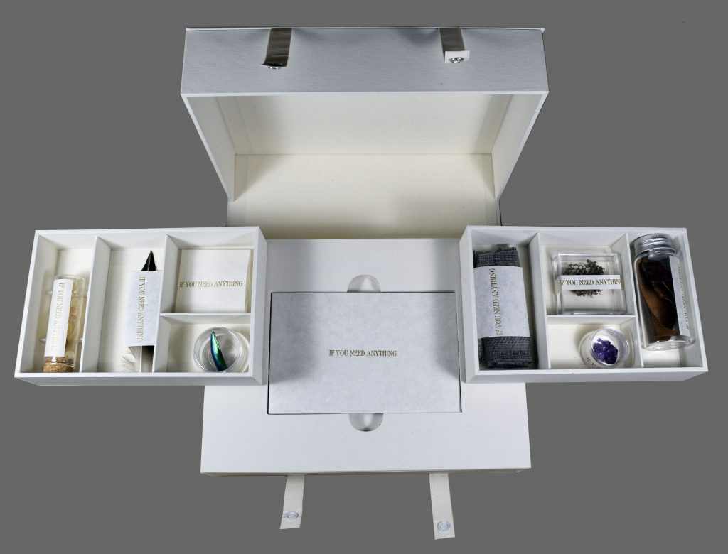 The compartments contain a collection of sentimental objects that I have saved over the years in case I ever needed them: beads from my great auntie’s necklace, remnants from past projects, scraps of cloth from my grandmother’s sewing kit. The booklet is filled with memories and the origin stories behind each object. My hope is that this “third aid kit” can be used to help navigate those moments in life that have a distinct before and after, to soothe the areas that physical and mental remedies cannot reach.