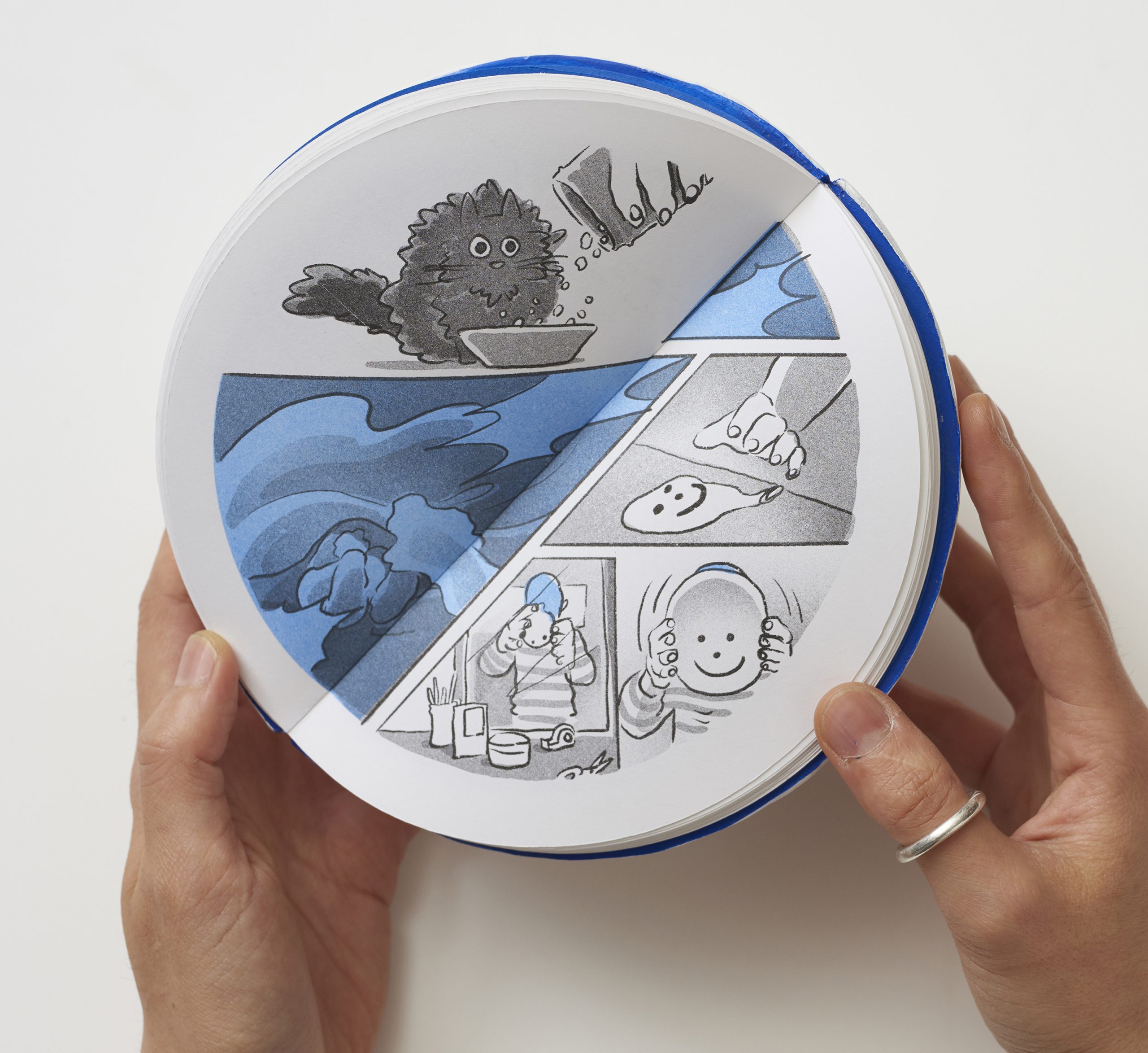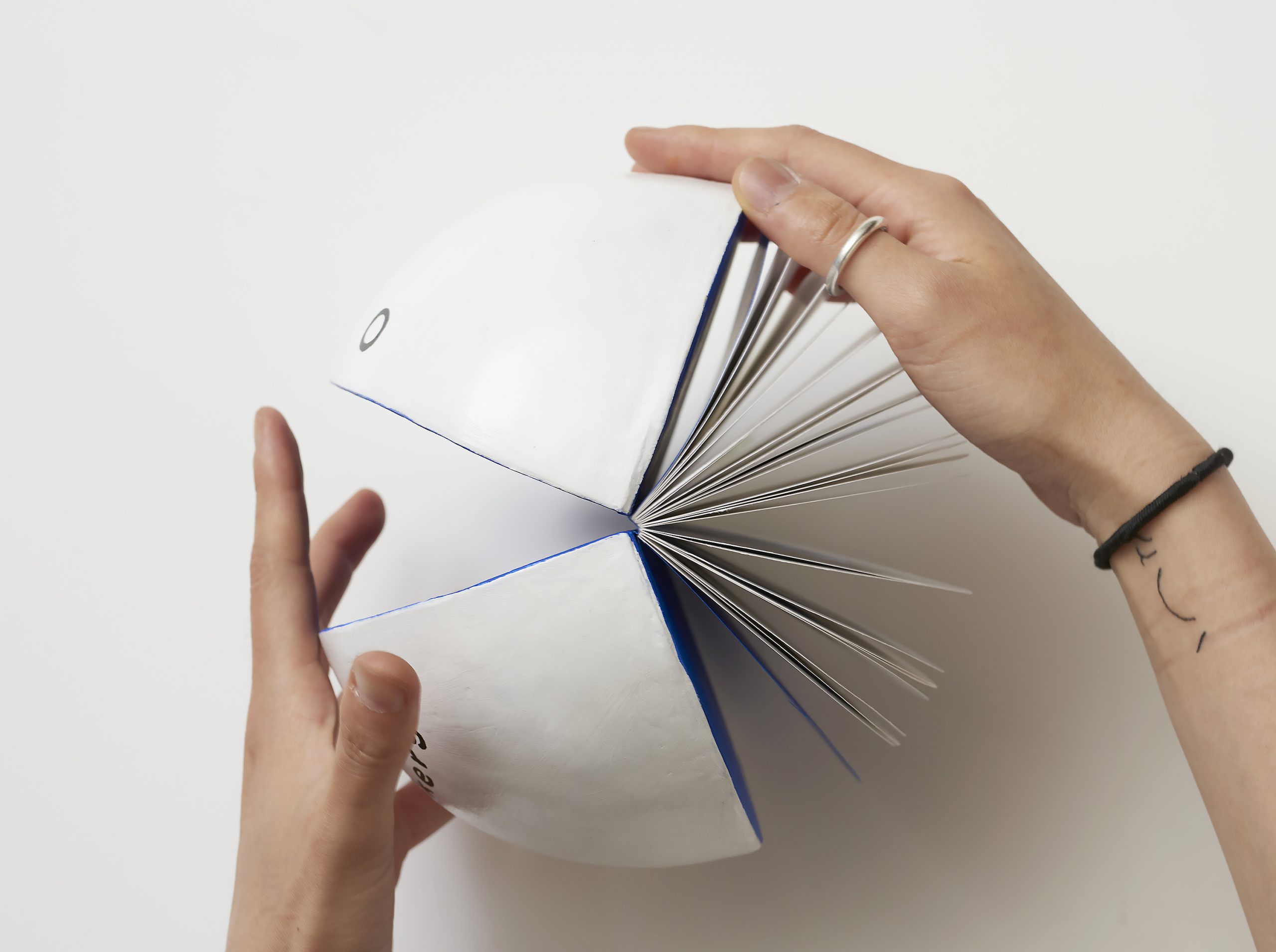 It is an edition of 50: number 1-20 are in a slipcase box with paper mache dome covers; and number 21-50 are bound with flat hardcovers. Pages were risograph printed on Mohawk Superfine Smooth in two colors, cornflower and black, and cut to a circle shape. Books are perfect bound with Neenah Astrobrights Blast-off Blue.