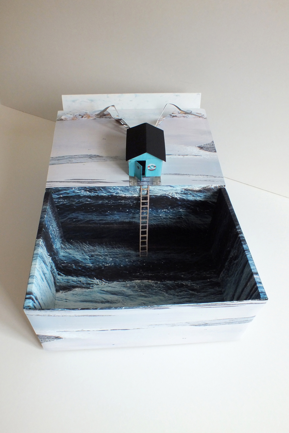 My work is a kind of a pop-up book based on a lot of photos, I have taken of the real place at the beach. The little bathing hut is a pretty accurate mini model –- whereas the long ladder leading is more fictional to give an impression of the diving into the big ocean, which I hope, you can imagine when looking into my work.