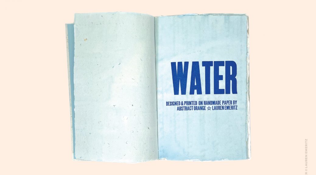 This book explores water in nature. The text follows the flow of water from drops to streams to rivers and oceans. It juxtaposes the beauty of water in nature with detrimental aspects, such as disease, flooding, and drought. The book is composed of paper handmade by the artist. The process of paper-making uses a lot of water. The book contains the magic of water, even if the water was pressed out of the sheets. Both the text and the paper itself convey the power of paper to shape our lives. See additional images at AbstractOrange.com