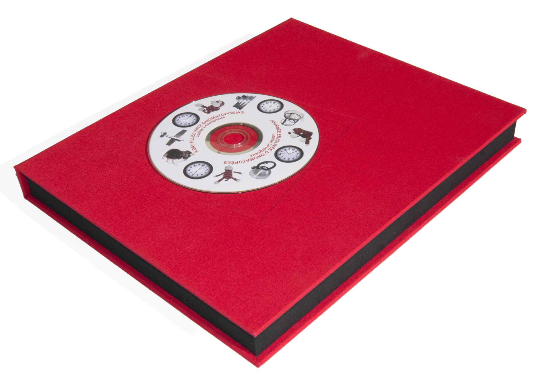 A Day Filled with Onomatopoeias is housed in a clamshell box covered with red and black cloth with an inkjet print over a CD.