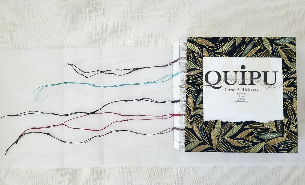 A quipu is an ancient Incan device for recording information, consisting of variously colored threads knotted in different ways. I have used the knotting with linen thread on the binding that tells the story of my relationship to Inca Tupac Yupanqui, my 21st great grandfather.