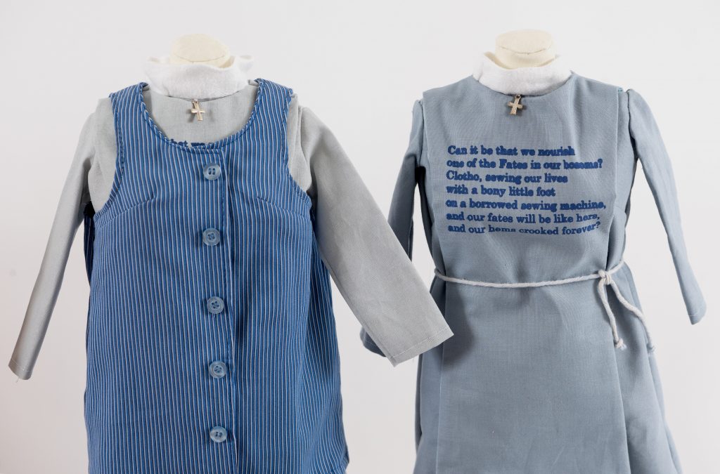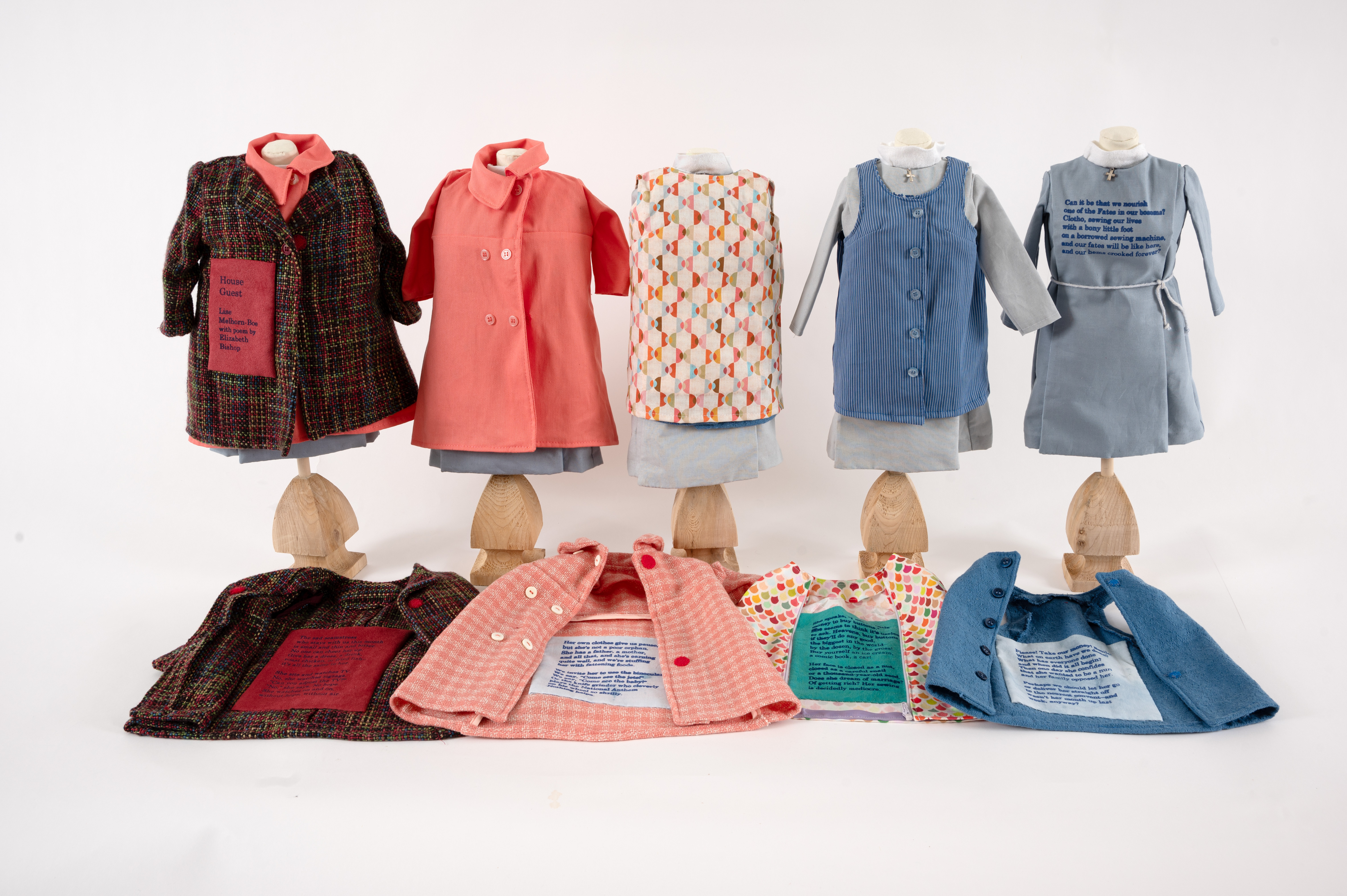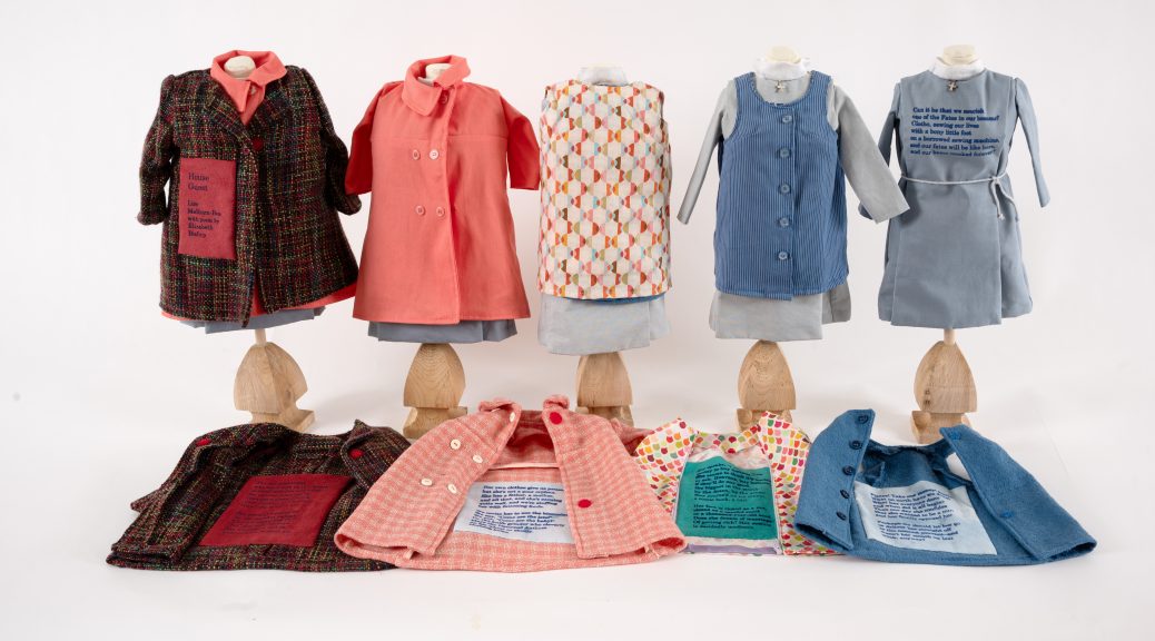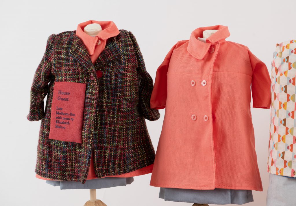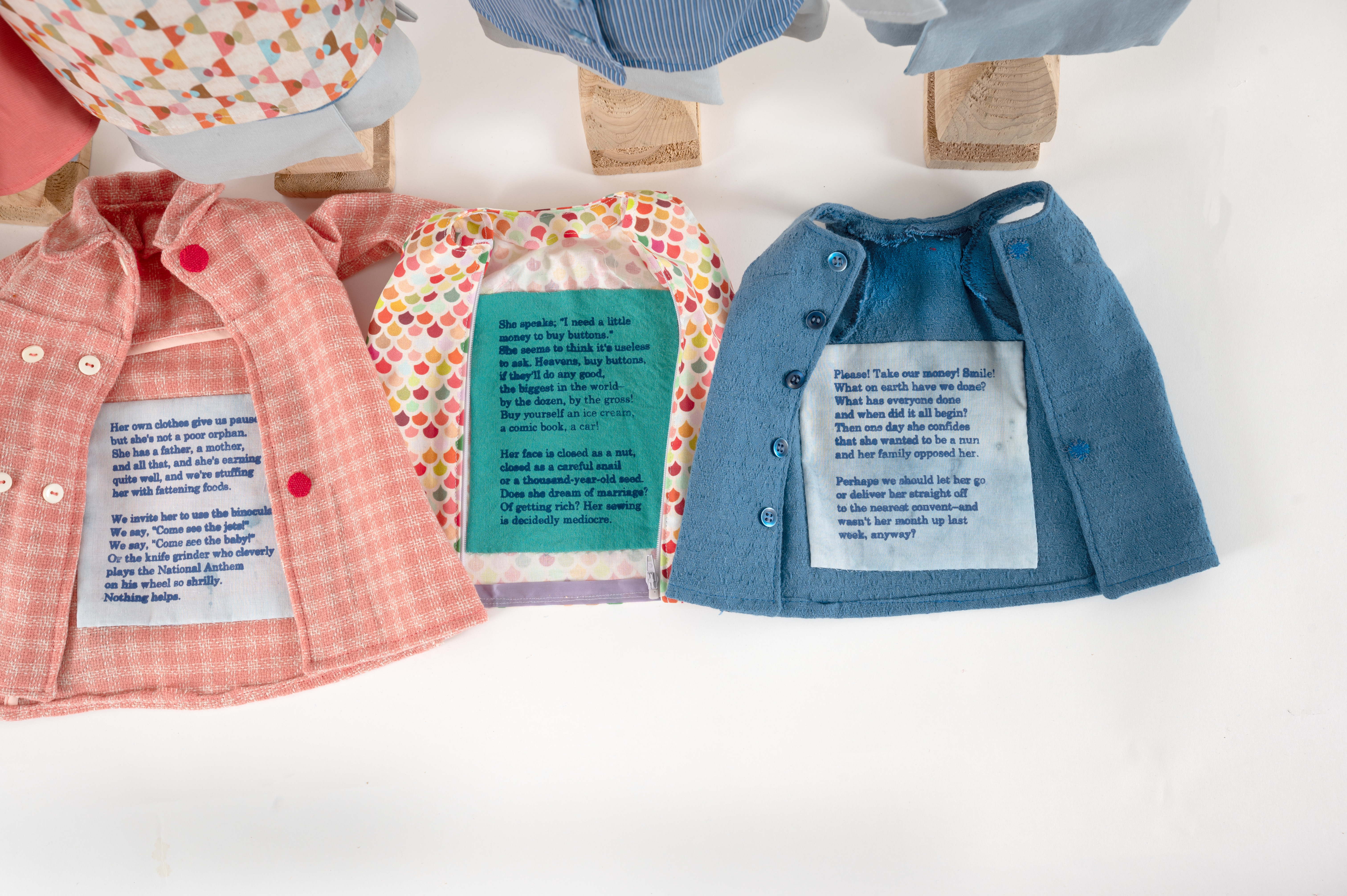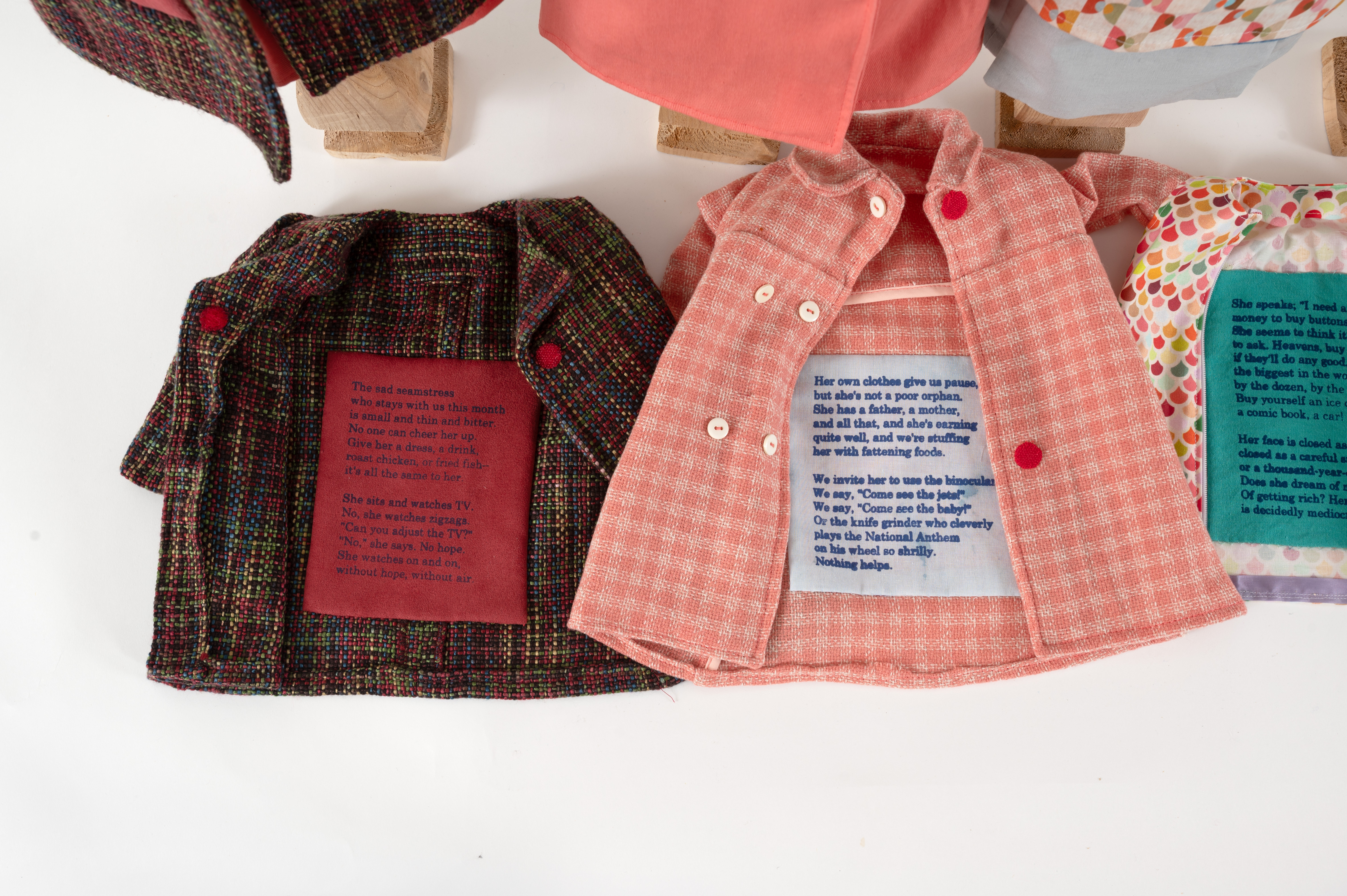 Elizabeth Bishop’s funny, yet poignant poem “House Guest” is about a depressed seamstress. When questioned, she finally reveals that she would rather be a nun. The dressmaker’s Judy (dummy) is layered with five garments—all based on clothing from the 1960s, as that was the decade in which the poem was written. The first coat was made from fabric from a suit of my mother-in-laws, which she wore in the 1960s. The second coat is a copy of a coat which was worn by Queen Elizabeth II. Removing each of the first four garments reveals a stanza or two screen-printed inside the clothing. The final verse is printed on the front of a 1960’s-era shorter nun’s habit. (The colophon is on the back.)