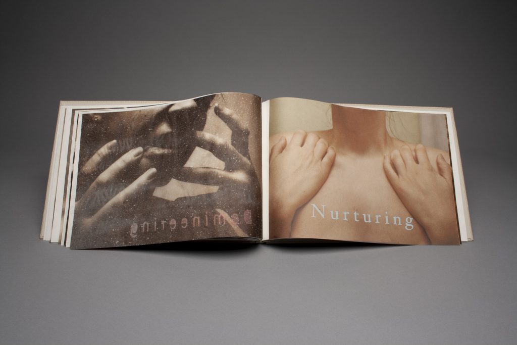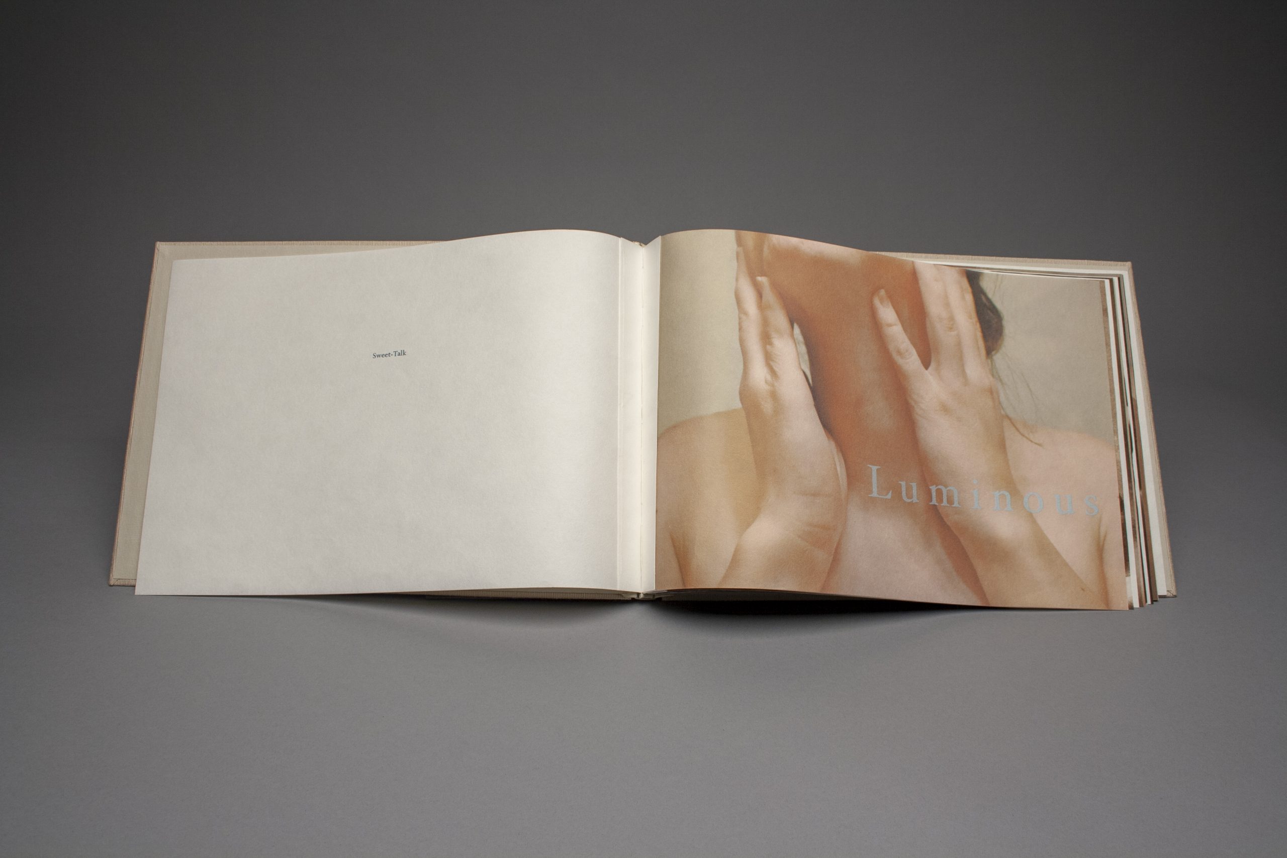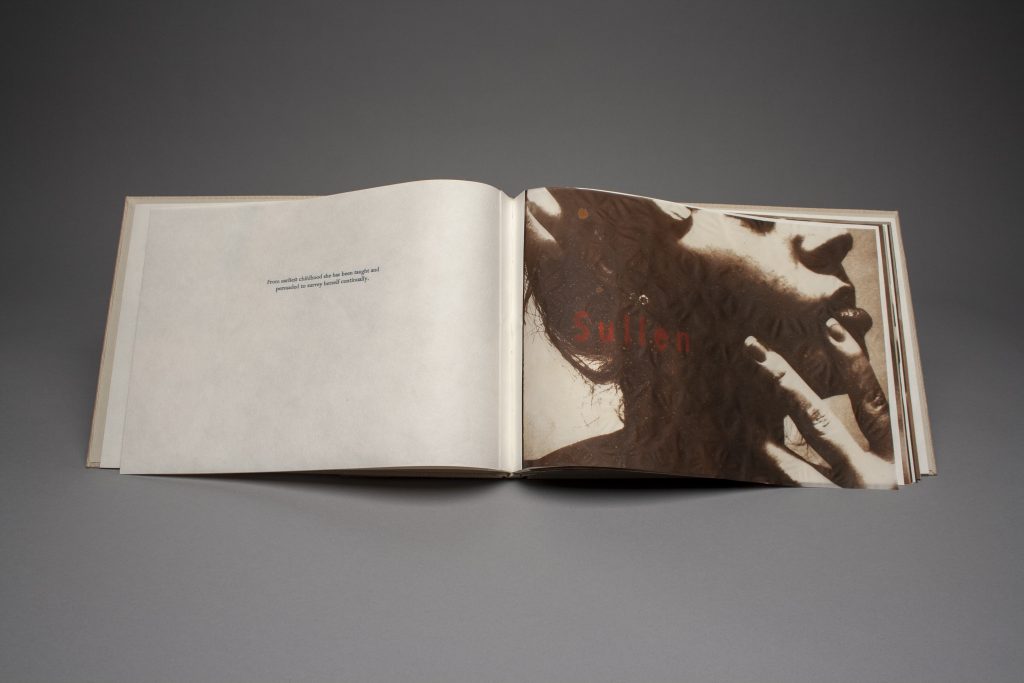 In Sweet-Talk, I broke up the text through a series of photographs and prints that switch back and forth between bright posed colored photographs on soft Japanese Mulberry paper, and somber monochromatic photos on rigid transparent abaca paper. Each photo is accompanied by a larger word that is used to describe the female such as “luminous,” “mesmeric,” “domineering,” “sullen,” and “noxious.” These words are directed at females either as desires, fears, or common labels. This book shows the split between the two selves of a women, exposing a picture-perfect performative side as well as a vulnerable, dark side of women that no one usually sees. This book puts the reader in the surveyor’s position, seeing all perspectives of a woman, as an object and as a subject, highlighting how a woman may act differently for others, how she wants to be seen, how she views herself in private, how she can be viewed in a positive way or negative way, and how she is aware of all of these perspectives, at all times.