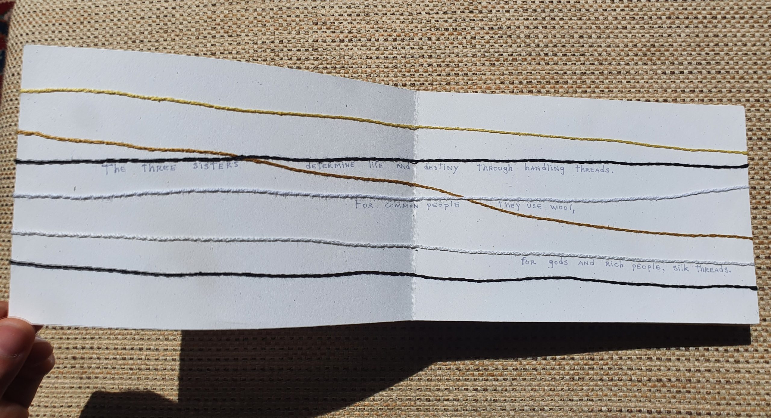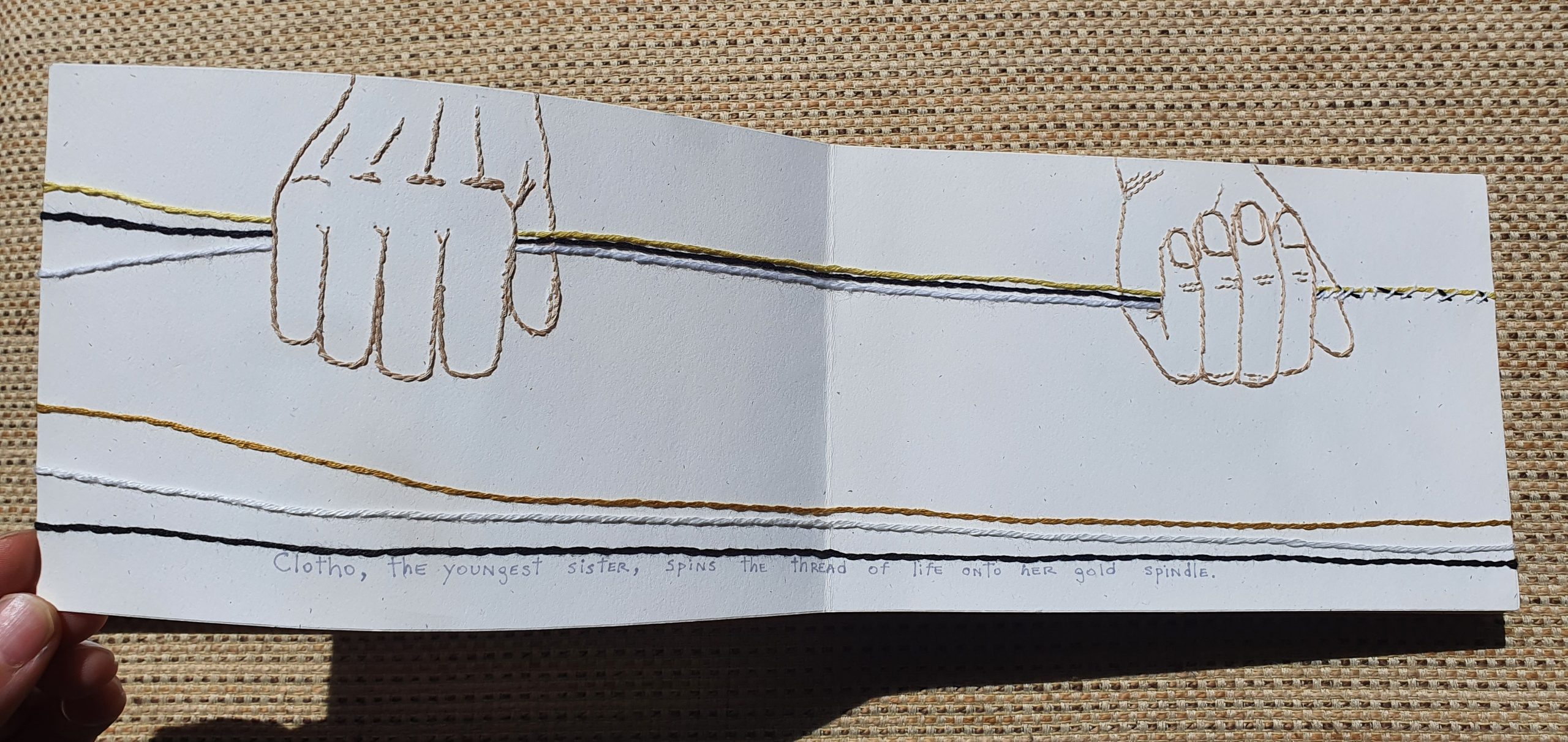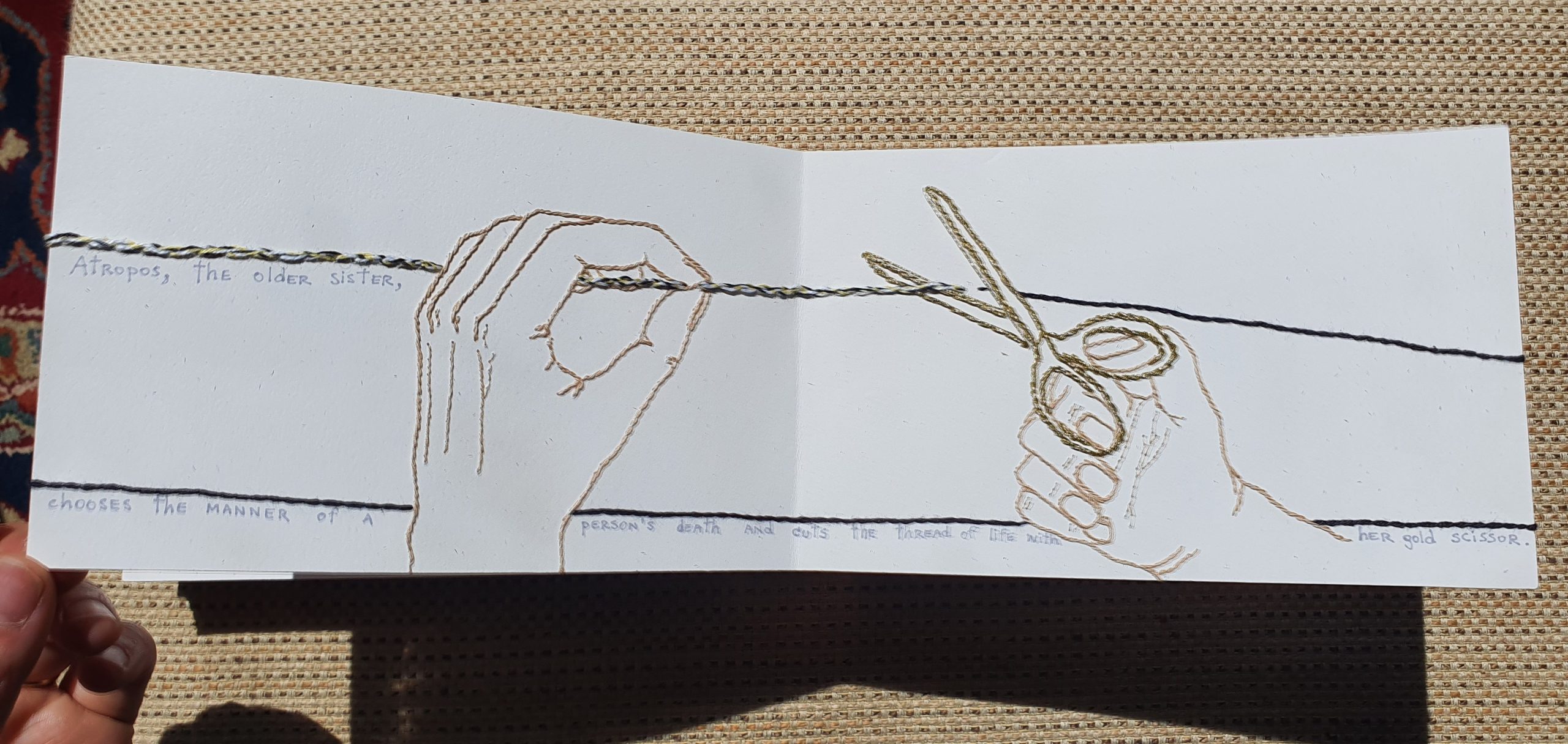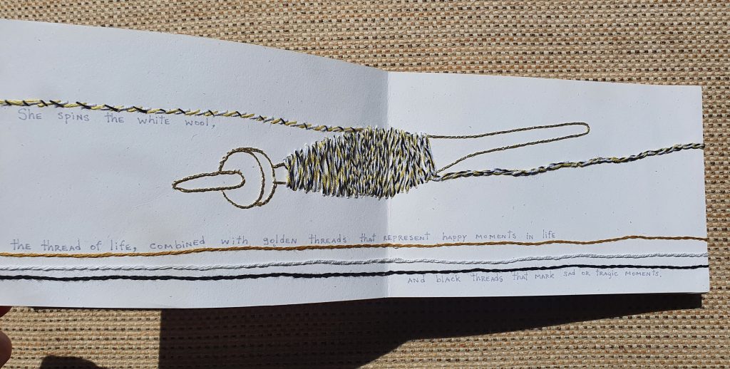 Memento Mori is a book based in Greek mythology, the Moirai. Three sisters who manage the life and destiny of humans with a thread of life. The artist creates the images with the concept of the thread going around the book and the binding, so the book is completely made with embroidery on paper. The text is handwritten. The idea of this work appeared in the middle of the pandemic, while studying diverse ideas for different projects, the concept of death and it forms was frequently explored.