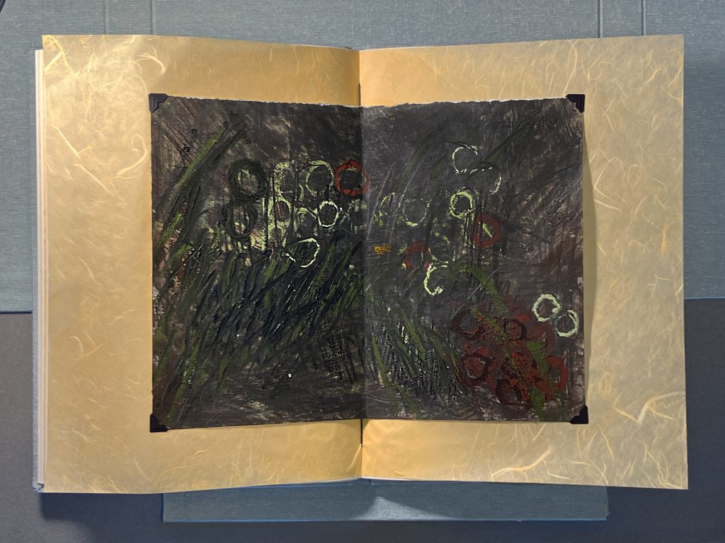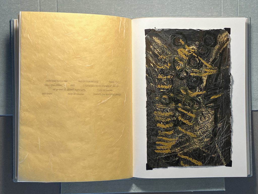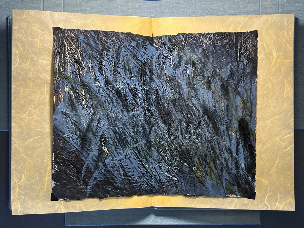TELL (self-observations of a paramnesiac), combines materials and processes that would be very familiar to a 10th century scribe, with present day making techniques, imagery ,and poetry. In this project, rather than inserting digital reproductions of my prairie drawings, I’ve tipped in the actual, original oil stick, pastel, graphite, and charcoal as a nod to ancient books that I love (Kells, Durrow, et al) – that contain hand wrought, one-of-a-kind images of wildlife, landscapes, saints, and sinners. In my book, the drawings reflect on the wide-open prairies of western Minnesota where I lived during winter/ spring 2024 while I served as Distinguished Visiting Professor in the Liberal Arts, University of Minnesota Morris. Night comes quickly to the northern plains, and these drawings document that brief time when dusk draws down, and the landscape becomes a blur of field stubble, red sumac, and just plowed black Lester soils ready for planting. It is my intention that these images communicate a richness countering my book’s gilded and ornamented binding and outer folio, while also suggesting alternate interpretations of “lush extravagance” in the exuberance of their energy and materiality. Likewise, my project’s poetry is an effusion of language addressing the deep geologic and human histories of the northern plains, with my own sometimes blurred and conflated memories of a part of the world where I was born and raised.