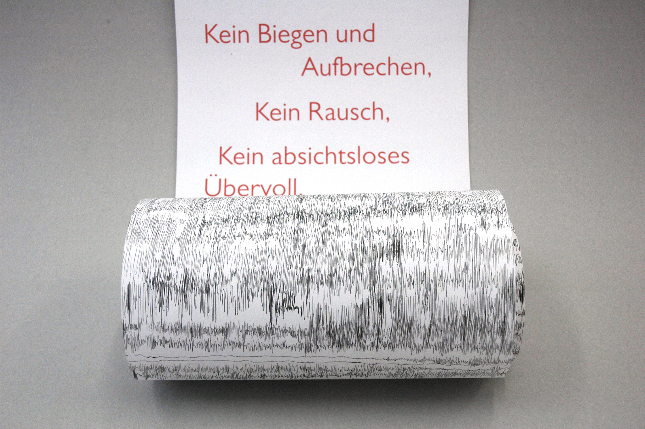 The most complicated part is the electronic and codeing part of the book. As I have nearly no idea of electronic work, but in my partner I found a big help. In the tube is a extra smaller tube with a printed circuit board, connected with an mp3 player, batterie, transducer and lots of cabels. My vision was to express the intimate connection that the recipient can have to an artist book, when he/she touches it. And also the intimate relation humans can/should have towards plants and trees. So know, when you touch the tube the graphite electronically conducts towards the circuit board and you can hear the musical approach to the sound that pine trees make – when you lift your hand, it stops. And goes on, when you touch it again. If you are interested, I can also send you a movie and a sound file of the book! For this book I receaved a lot of help: sound recordings by Marcus Mäder, music by Alexander Müller, drawing machine by Alex Rex and content support by Dr. Michael Schwarz.