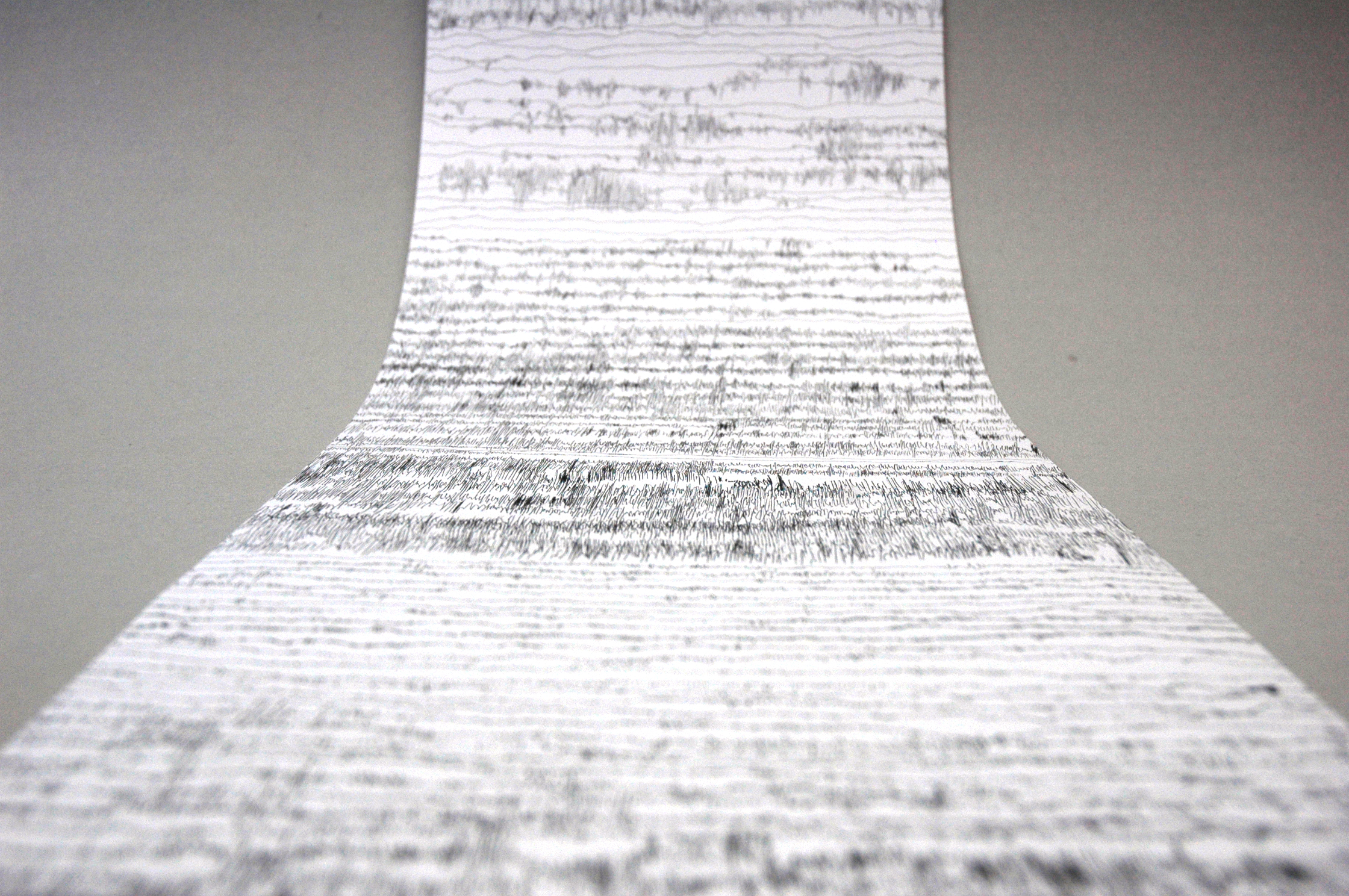 Artbook made of: one-of a kind machine drawing, touch sensor, transducer, cardboard, paper, sound, screenprint, graphite
