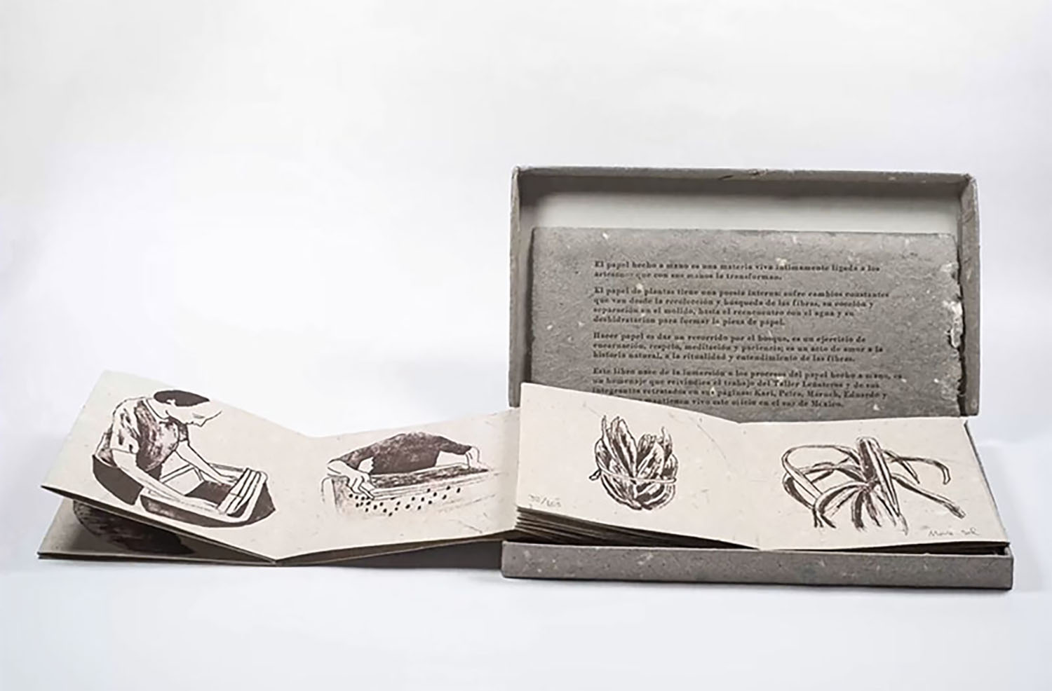 The book was made on handmade paper with cotton, pineapple and papyrus fibers. The text was printed in movable type and the images in lithography, with an edition of 105 units in collaboration with La Ceiba Grafica.