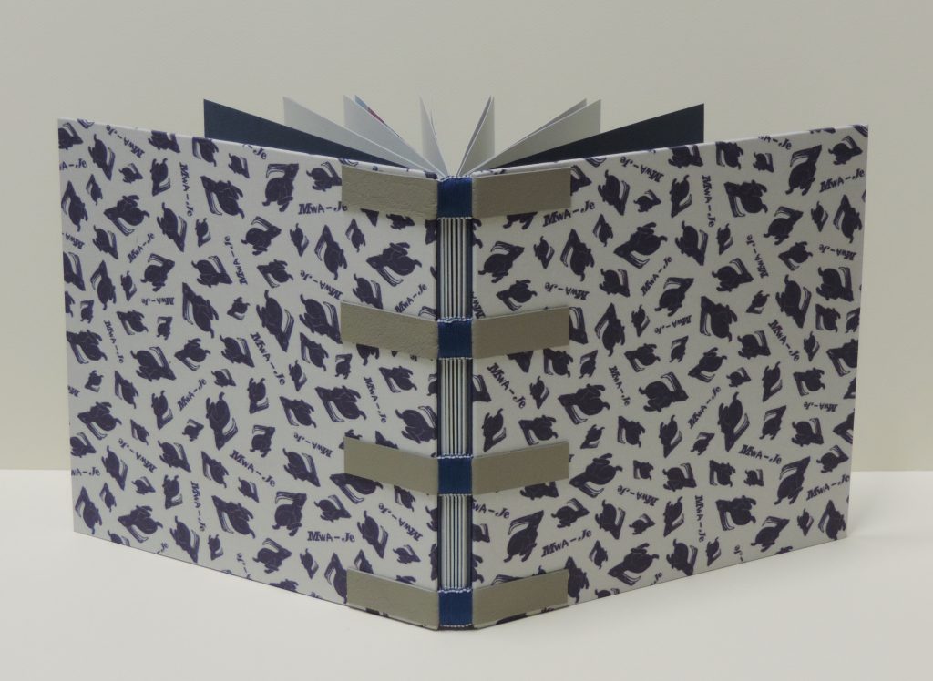 « problem » which has bothered me for a certain period : I like to have colored thread showing on the outside of the binding, but I would like to be able to match the color of the thread with the paper on the inside…. This is the first binding where I was successful.