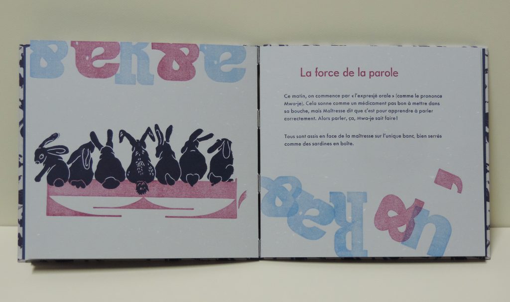 Images : the little rabbits are done in linocut and hand printed on an etching press. The other parts of the images are printed on a proof press from wooden letters which were once used to make posters and are now part of my collection of type. It was fun to convert them into tables, seats, cars, fish bowl, etc. !