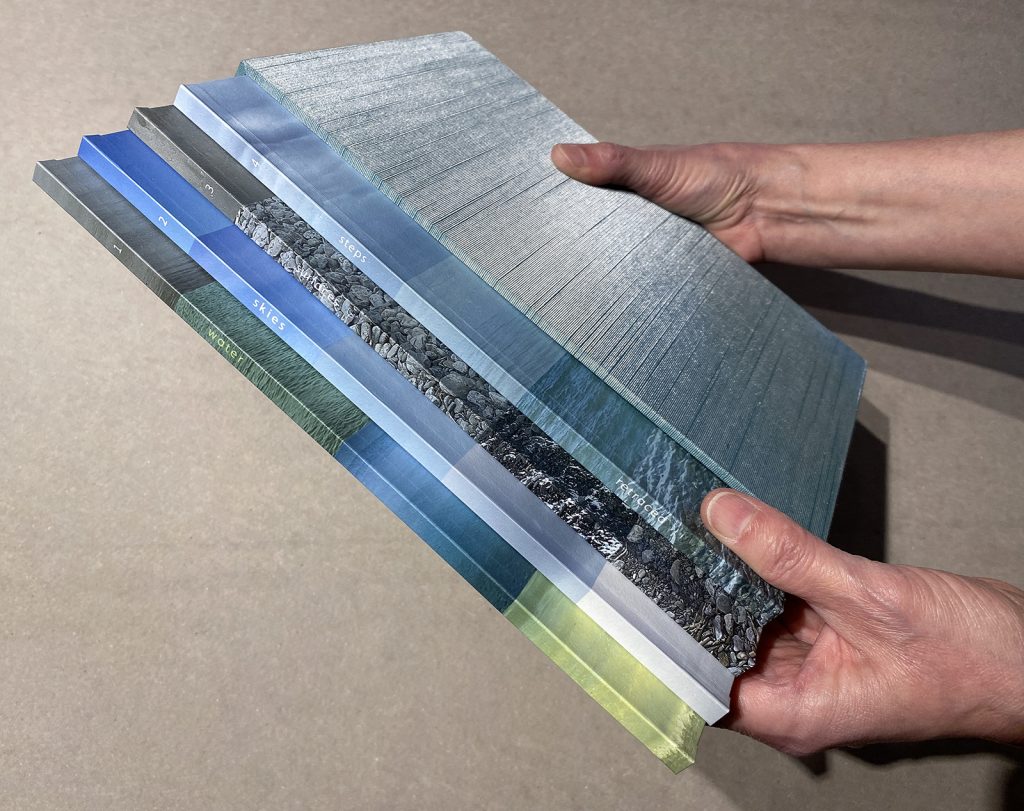 where steps stop is a four-part work about the flux of water, sky, ground, and their visual convergence. This piece is also about the nature of printing; how the record of an ephemeral situation is transformed to become a fixed printed object. In addition to the construction of images via the physical strata of print processes is the overlay of the written word. Each volume uses drum leaf binding to provide an uninterrupted image/page spread surface. The spines and covers form a word flow that links the four volumes.