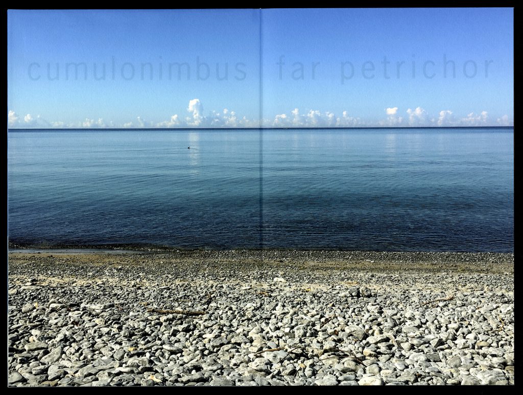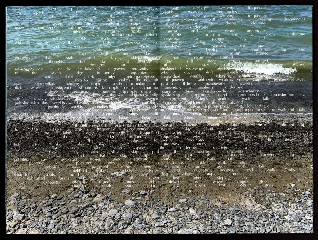 The fourth, and final volume, steps stop, was inspired by driving to the lake with the car radio on while the frequencies flickered between the music of Arvo Pärt and other stations. This led to an exploration of the compositional structure of Pärt’s music. His use of a repeated and evolving triad structure with a parallel melodic line is echoed by the triad of sky-water-land and the floating words that slowly build, then stop. This volume consists of six archival digital pigment prints on Aya paper, typeface: Optima.