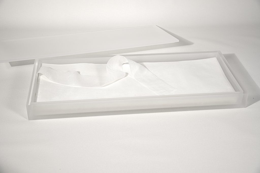 The design of a book of whispers is characterized by a close congruence among concepts, content and materials. Voices that are fleeting, barely there underlie the key design principles of minimalism, white space and translucency of materials. Flawless, manuscript-quality calf vellum was thinned at my request to 1/10 mm for the cover of the first volume. Limp vellum binding of flax folios reference linen, the material used in ancient Greece. And the difficult, demanding technique of watermarks was chosen for the bespoke folios with 26 individual watermarks on an antique mahogany mould. Both books are housed in a custom enclosure made of 3/8th thick Plexiglas sandblasted on the outside. In contrast to the fragile books, the enclosure is rigid and solid, linked to a sarcophagus of frosted glass that once closed hints to the content it protects.