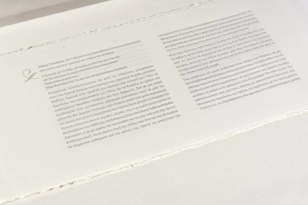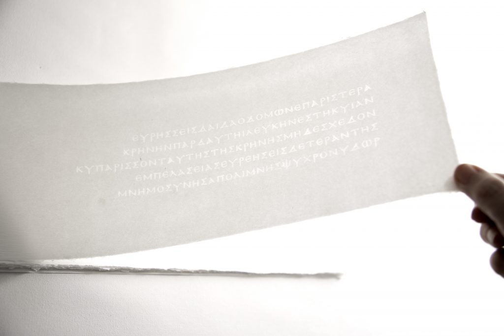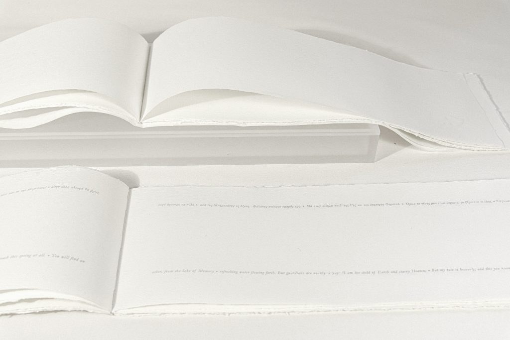 “a book of whispers” is an artist’s book in two volumes. The first volume references sacred texts from six gold lamellae belonging to women initiates to Orphism, which give specific instructions for the soul to follow on its perilous journey to the Afterlife. The sacred writings of the gold lamellae have a metaphysical character. Perceived as “whispers,” fleeting hovering on the cusp of perception, of consciousness. these texts are given visual form as watermarks within flax folios. A watermark allows the sacred text to remain hidden, in a latent state within the fibers of the paper; it comes to life for a moment, as the reader lifts the folio and light illuminates it. In a companion book, an essay gives the personal narrative and the historical context for these mysterious objects. To make the voices of these women “heard,” the sacred texts are letterpress printed in pale ink as flowing ribbons in modern English and Greek.
