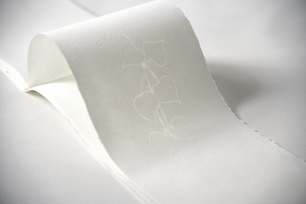 watermarked text on bleached flax paper, letterpress printing from polymer plates, handmade flax papers for folios and covers, limp binding in vellum and custom flax paper