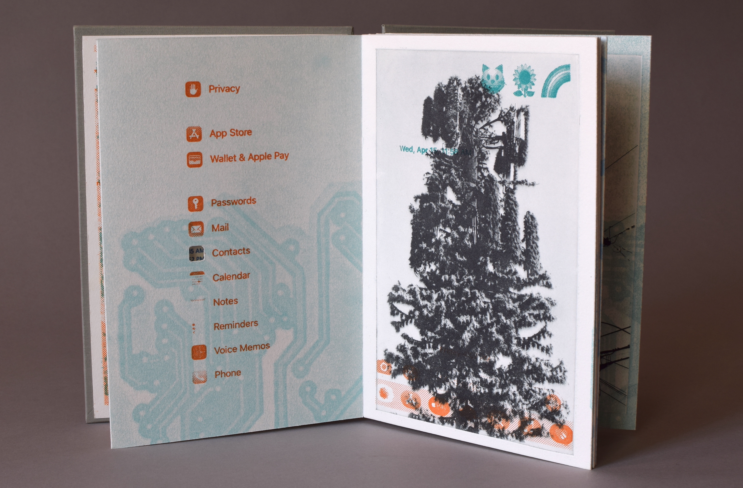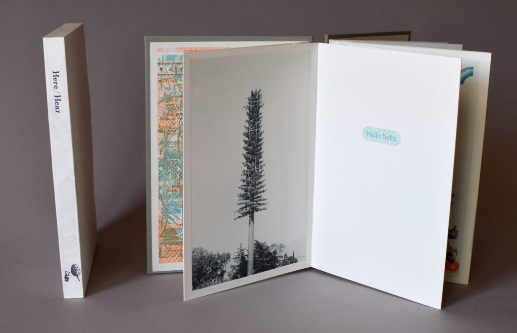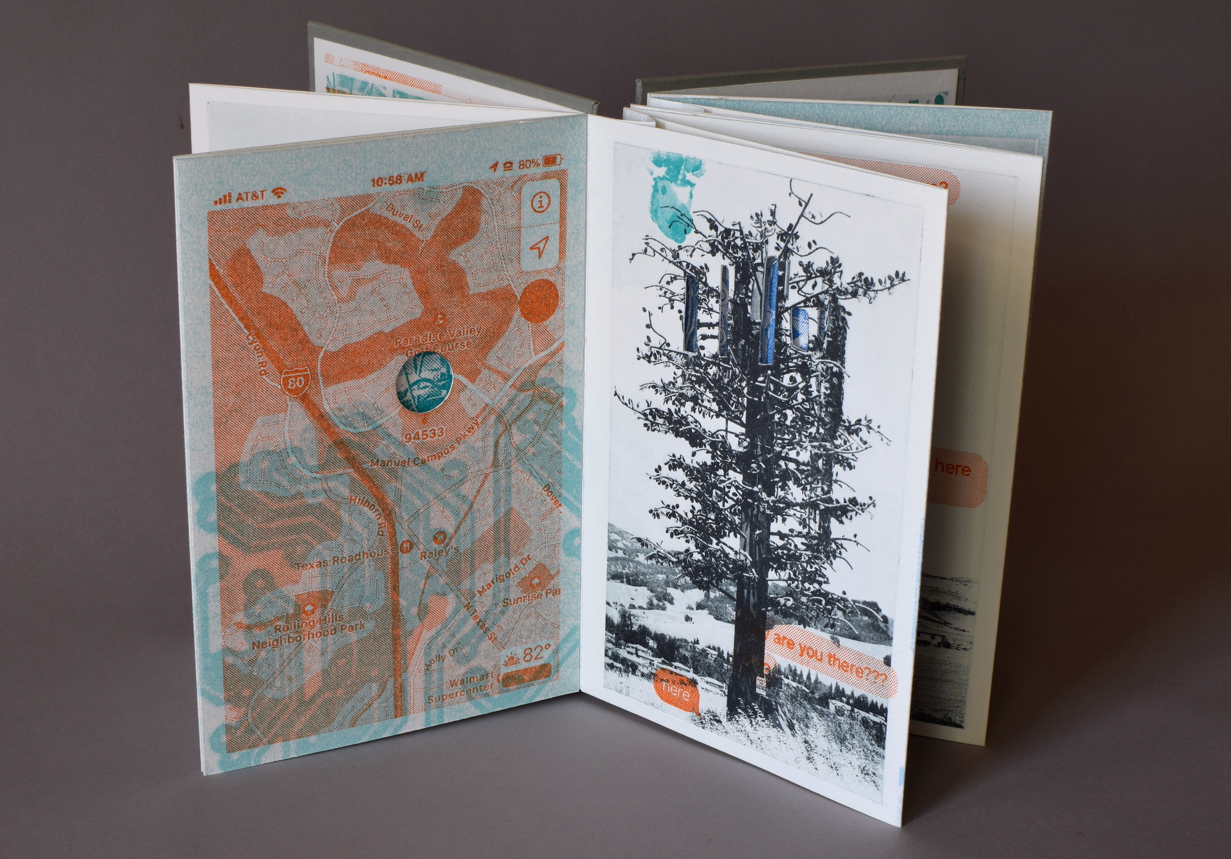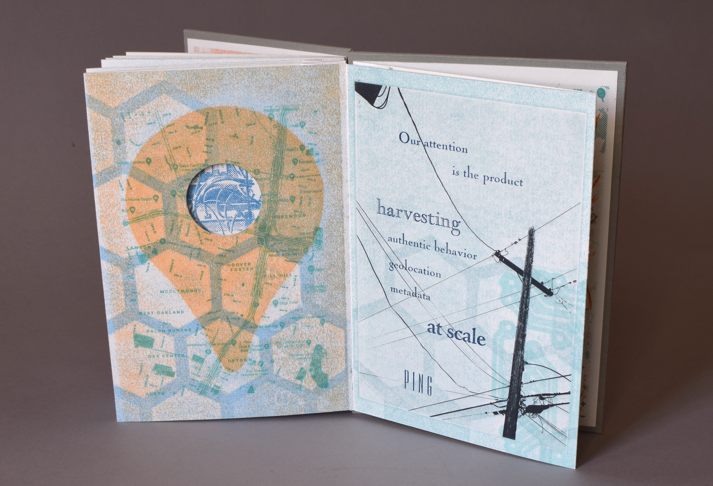 The work expresses nostalgia and anxiety produced by constant and rapid change. In the artist’s book, Here/Hear: Meta Data Mining, cell towers disguised as trees represent our need for constant connection, our desire for infrastructure to be invisible, and our complicity in the data extraction industry. They are silent witnesses to our movements and interactions, enabling the transformation of our attention into commerce. The intaglio-printed cell towers as trees evoke a romantic and iconic view. Screenshots of maps, and texts exchanged by Mary Marsh and Tony Bellaver show our habits of sharing our location and plans. Letterpress printed folios adhered to an accordion-fold spine, holes cut into pages reveal wires and data, unseen systems in our infrastructure.