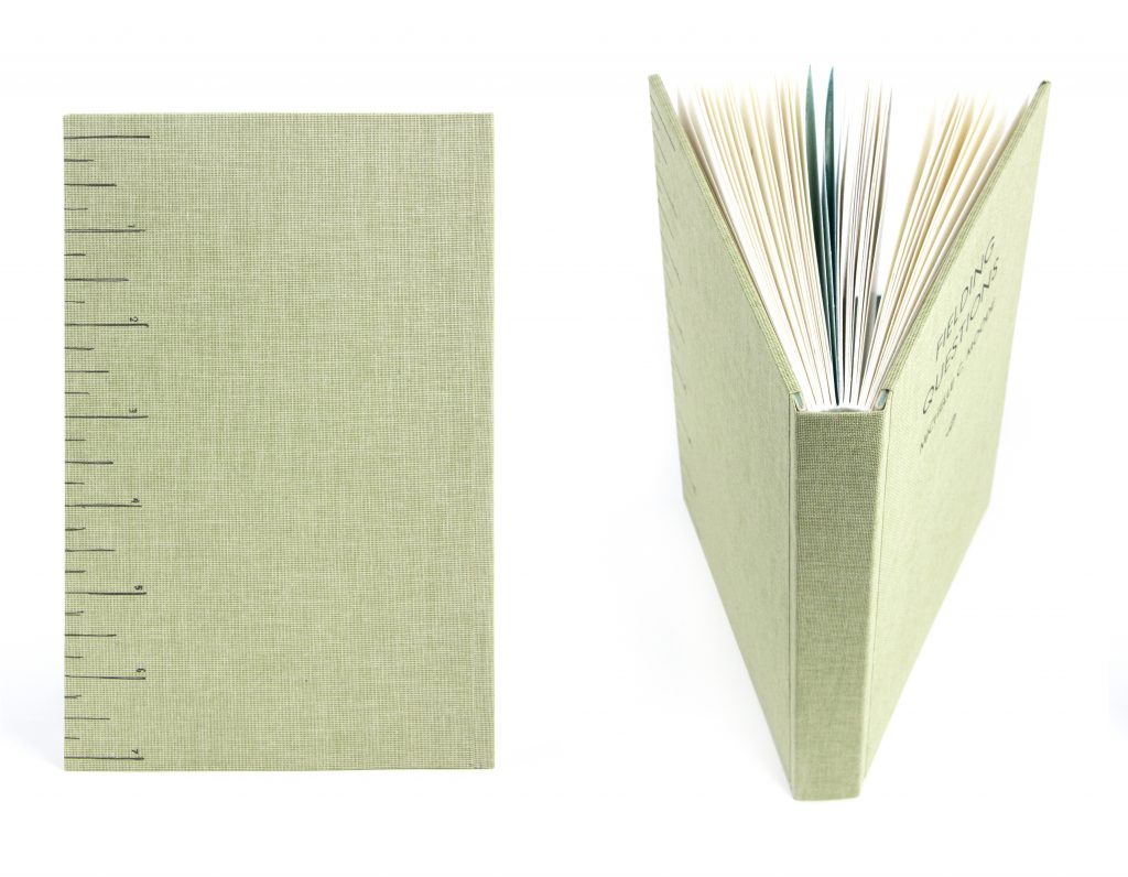 A field guide offers authority, while also being an accessible resource to the non-expert. Field guides present idealized, abstract representations of the natural world, with common specimens alongside the rare. The design, binding, paper and material choices of Fielding Questions all work together to echo the aesthetic of a mid-century field guide. Text accompanies some of the images in the form of labels or short captions: some descriptive, some poetic. Text is printed from metal Twentieth Century Light and Futura Book, typefaces that exude authority and clarity, but in a friendly way. Printed on the back cover of Fielding Questions is a seven- inch ruler– another feature borrowed from field guides, which transforms a passive reference book into a functional tool. However, in Fielding Questions the notion that the ruler would be helpful in differentiating a snowflake from a whale, or an object from an idea, is a subtlety absurd detail.