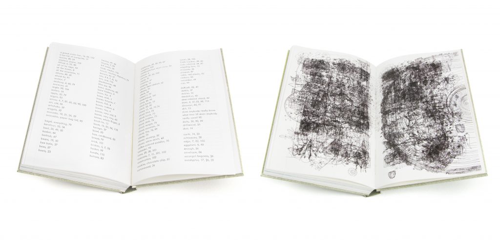 In addition to the traditional alphabetical index, there is a page spread that is printed with every image from each press run. The resulting composite image has innumerable layers, truly testing the limits of the paper on which it is printed. It exists at the conclusion, and acts as another form of index, as it depicts not only a tangled mass of everything in the book all at once, but also documents the process of printing the book.